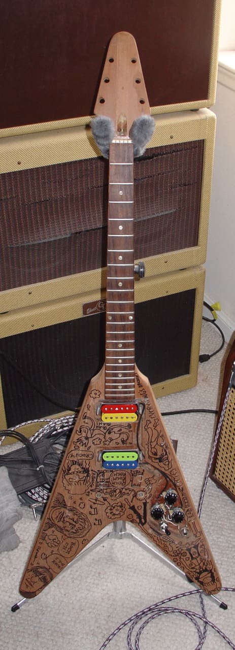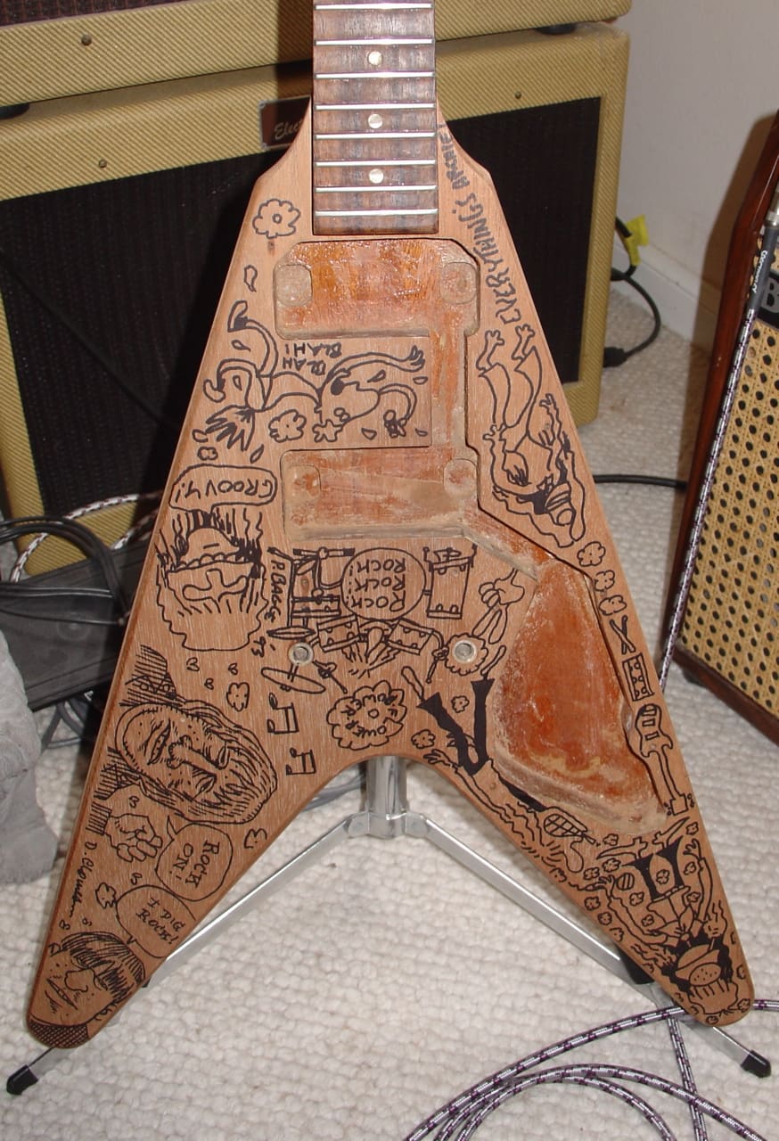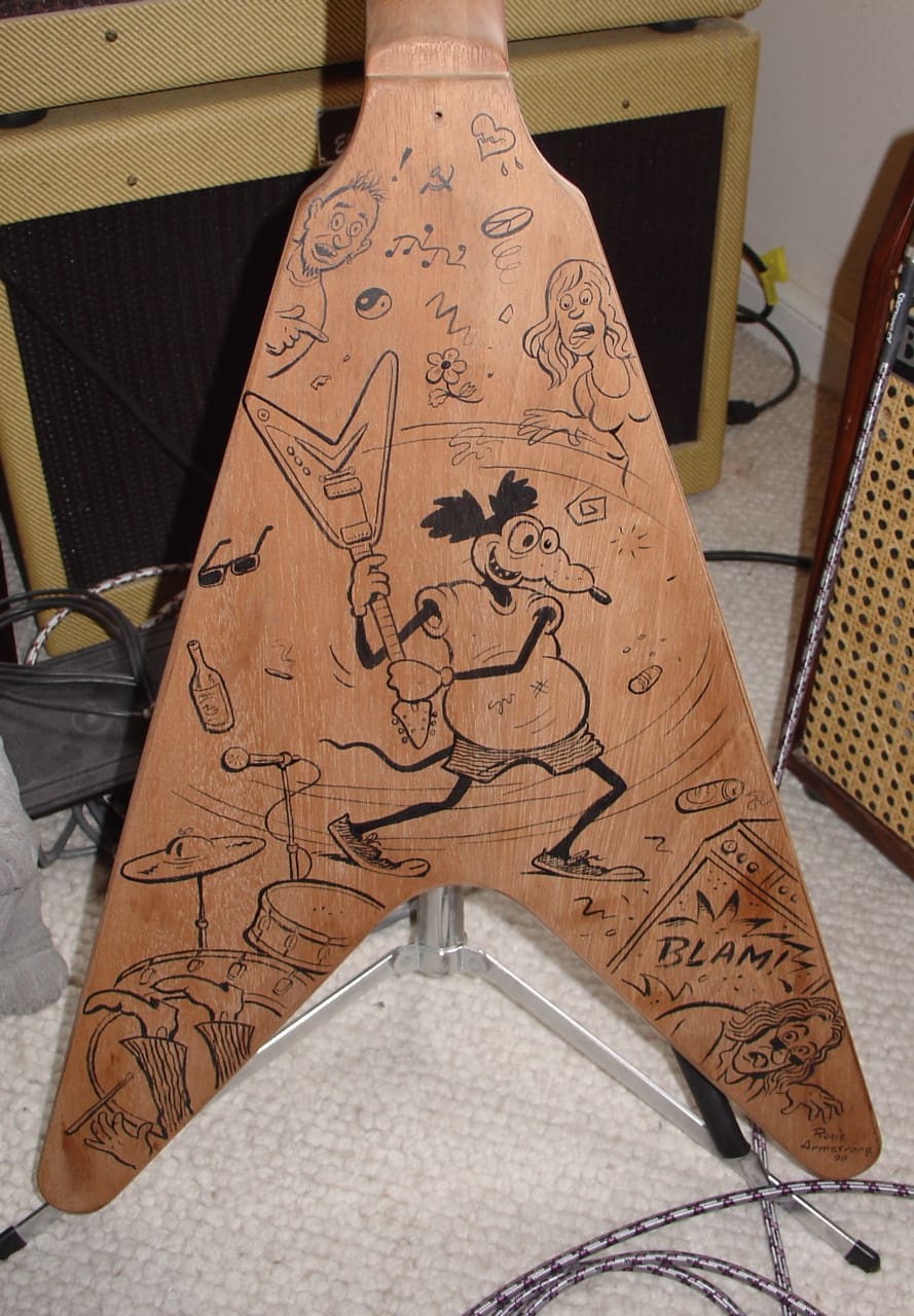 The guitar was originally made in 1974 or 1975 and I’ve had it since maybe 1983. The finish was in terrible shape, so I stripped it in a fit of youthful exuberance, intending to refinish it in red, and promptly lost interest in the project. In 1993 Dan Clowes and Peter Bagge were at a local comic store and I had the idea of letting them doodle on the guitar. When I got to the store, there was a huge line of fanboys with comics to sign so Peter and Dan were limiting each person to just a signature and maybe a dedication, but absolutely no sketches. When I plunked down the guitar and asked them if they would draw on it, they seemed to be really excited about the idea because they spent about 30 minutes doodling on it. The drawing of Mickey Rat on the back was done by Robert Armstrong in 1998. The great thing about Armstrong’s drawing style is that his musical instruments are always anatomically correct. The guitar Mickey is waving around is clearly a 1959 version of the Flying V, for example. I had a clear pickguard made for it so the drawings would show through. The pickups are custom Seymour Duncans. One of these days I’ll finish putting it together.