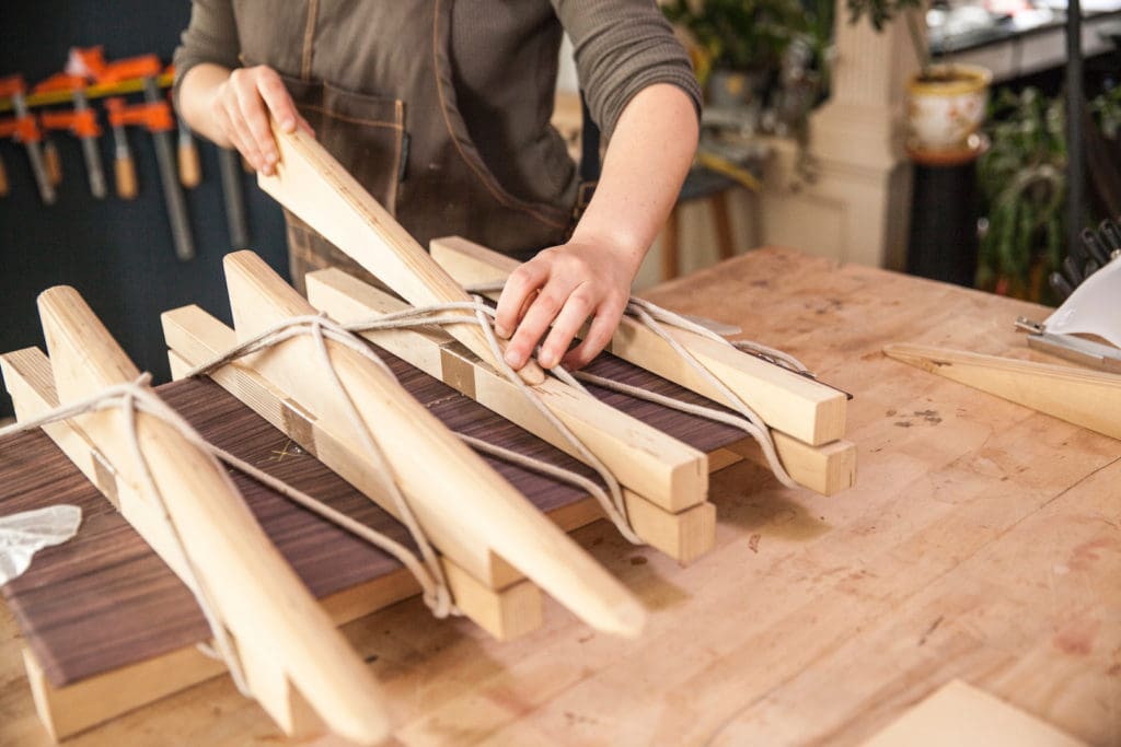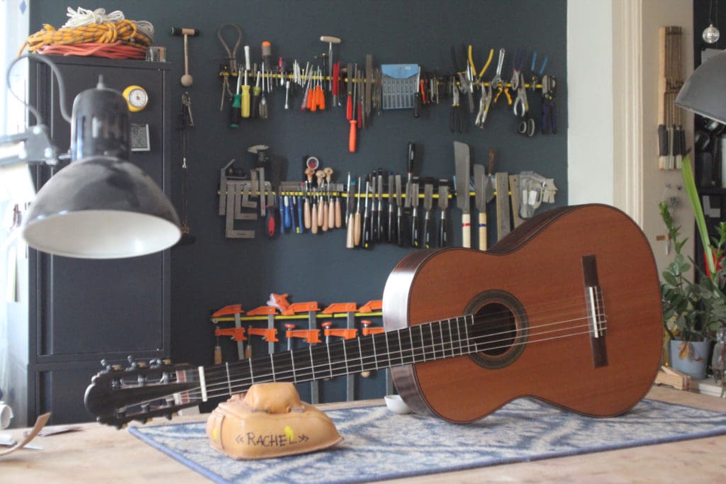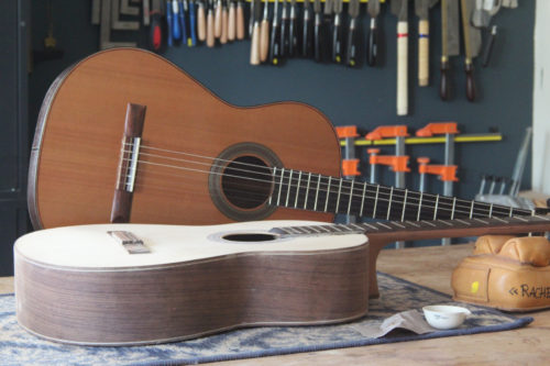 We find folks for our Bench Press column all kinds of ways – reputation, referrals, Instagram… and sometimes they appear, as if by magic, in our subscriber database. That’s how we found Rachel Rosenkrantz of Atelier Rosenkrantz. Rachel is a French builder, now based in Providence, Rhode Island, who has produced some notably eye-catching instruments, not just guitars but ukuleles, charangos and more. So we reached out, and, lucky for us, she agreed to be subjected to the Bench Press treatment…