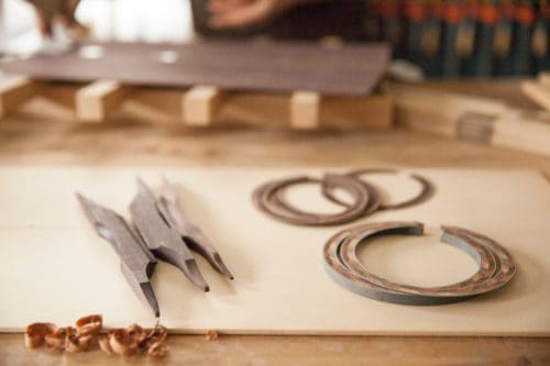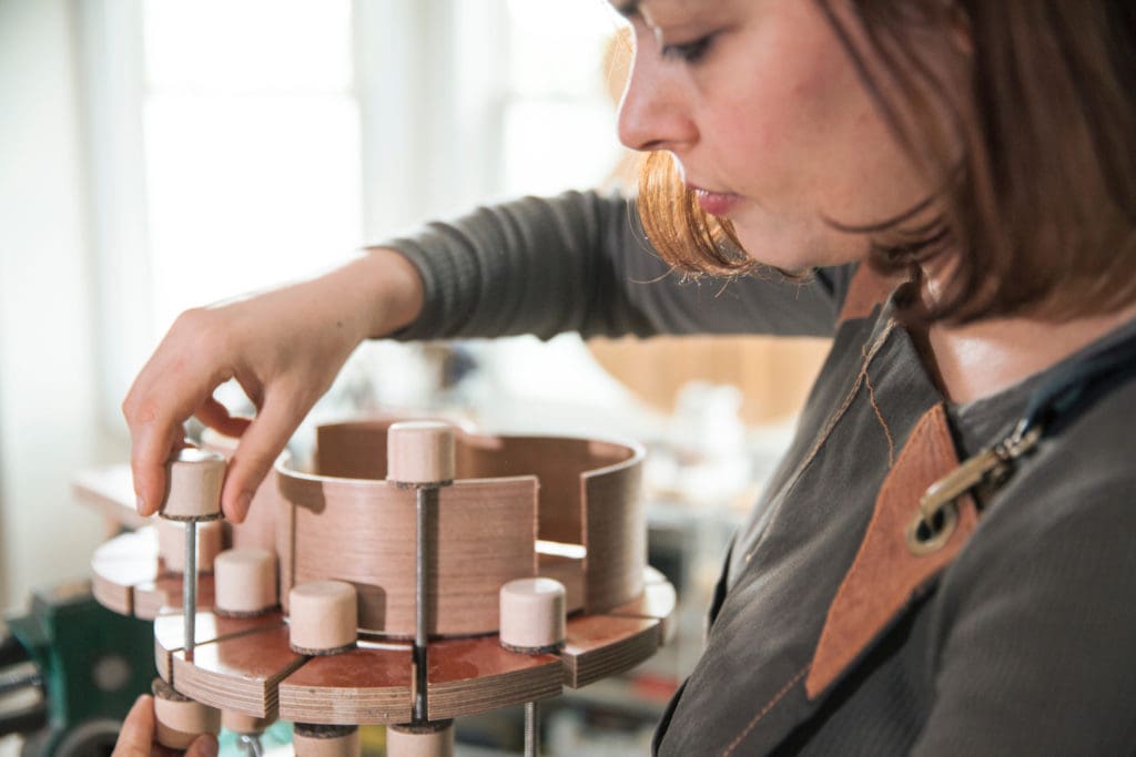 Rachel Rosenkrantz: Currently I have a gypsy jazz guitar on my go-bar-deck, a contemporary charango on my drafting table, I am half-way through the carving of a modern violin on my main workbench and French-polishing a mezzo-soprano ukulele on my secondary bench. I have a small box on my desk where there are piles of strange tiny metal objects for inlays on a yet-to-be-made humidor-guitar. That’s for a current one-of-a-kind/made-to-order commissioned work. I just finished the neck shaping of four classical Hauser-style guitars destined for retail. And on my machine-room bench I am improving the design of the jigs of my Shaker-parlor guitars – the design is based on the Shaker’s craft philosophy. And always current but on-site because it is too big for my bench, the maintenance of the Bosch Hurdy Gurdy, a 12′-long hurdy-gurdy designed and built based on the Hieronymus Bosch’s triptych Garden of Earthly Delights. The panel representing Hell depicts giant instruments including a boat-sized hurdy-gurdy and this one sounds as ferocious as the end of the world! The Rhode Island-based music composer Steven Jobe came up with this wild idea 10 years ago and made it happen for one of his operas, the instrument is now 10 years old and keeps improving all the time. The more it is performed the more ideas are generated to make it sound better. I love how it is organically growing into what it needs to become. Last, but not least, and leaving my workbench this week, the Passerelle, a guitar accessory I collaborated on with Kaki King, which is going to be released this summer.