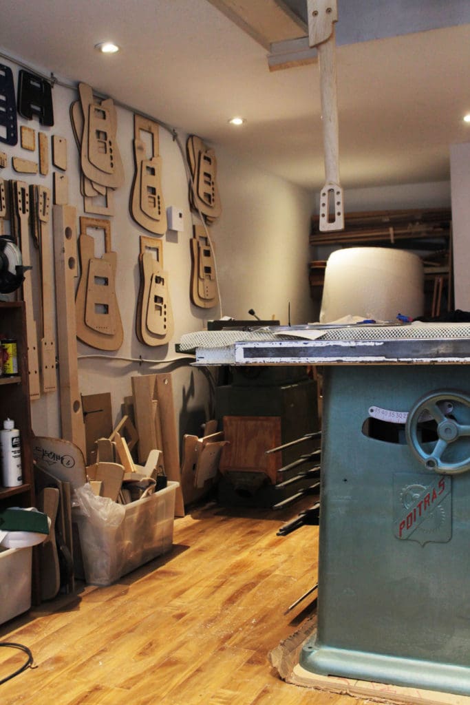 FB: I started building guitars out of necessity; I wanted to achieve that Steve Albini sound in his bands Shellac or Rapeman. I learned about the Travis Bean guitars he was using. So 10 years ago I went to cabinet making school. I got denied at the lutherie program, which I now see as a good thing! I started making guitars around my third year of school; I made a first prototype for what is now my MG6, heavily influenced by another aluminum guitar brand called Obstructures and also Travis Bean. After a few years of building guitars, cabs and pedalboards I started getting more and more orders and it’s now my full-time job.