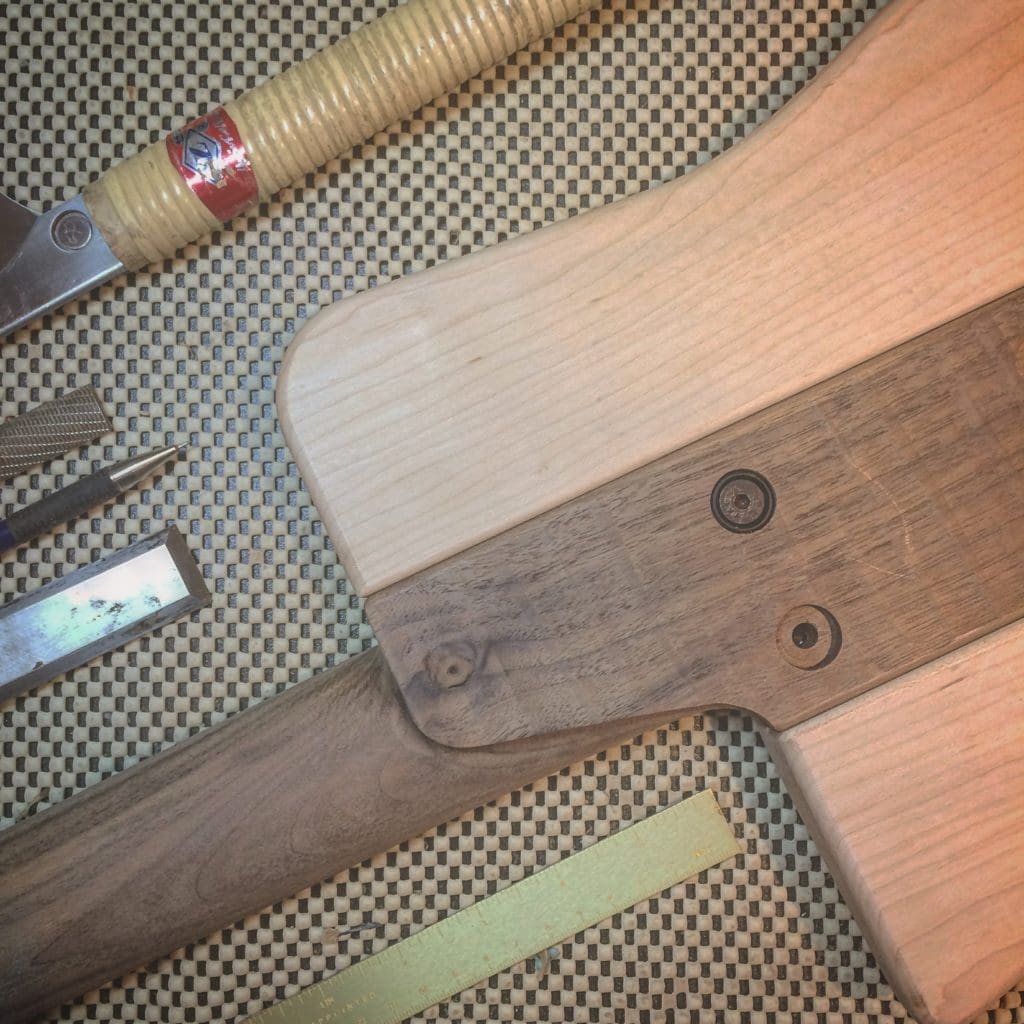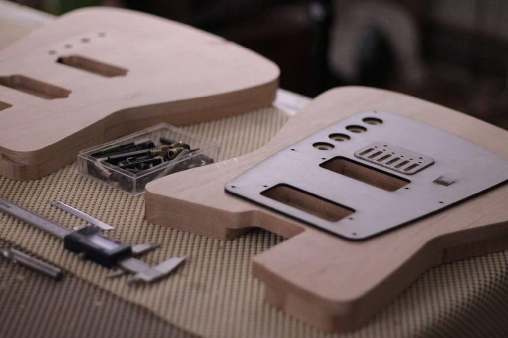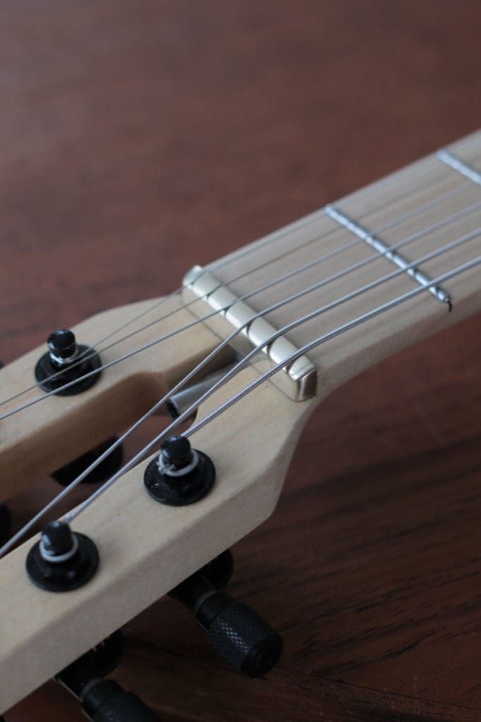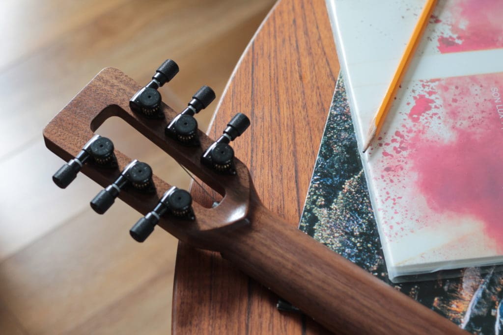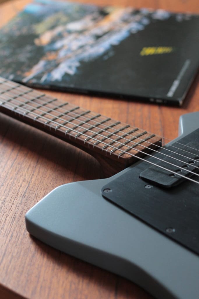 FB: I try to make everything in-house with as many local materials as possible. I refuse to use exotics and tropical woods, or any so called “green woods,” like bamboo. Materials that come from other countries need to travel and that’s a big no for me. My guitars are mostly made from maple, walnut and cherry. I may try Richlite in future builds–it’ll be very interesting to match to other woods, as it’s perfectly black. I have a rule to never use two different colored woods on one guitar.