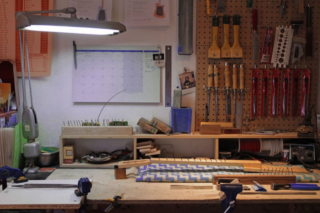 FB: I rarely take repairs in, so I don’t have much other guitars that end up on my bench, but after the Holy Grail Guitar Show in Berlin I traded one of my guitars with my friend and co-host of our podcast [In The Making], Nicolaï Schorr. It’s called the Owl and it’s super original and beautiful, with a sliding pickup system and very ingenious adjustable neck joint. Apart from that, I love my old Silvertone 1451, simple and efficient.