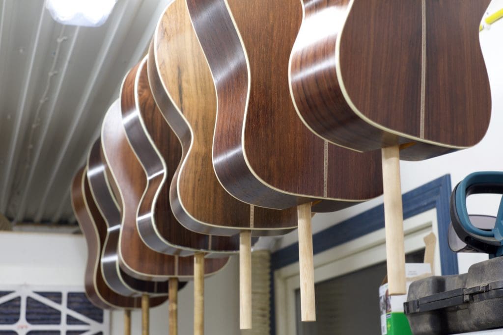 Per Marklund: I just finished the woodworking part on a batch of 10 guitars, which are all in the spray booth right now. I build in batches because I prefer to glue all braces and close the boxes during winter when the air is dry. That makes a dry climate the natural state of the guitar, which makes them much less prone to cracking when it’s dry, which is a great advantage if you live in the woods in northern Sweden (or anywhere else where the climate can be dry).
