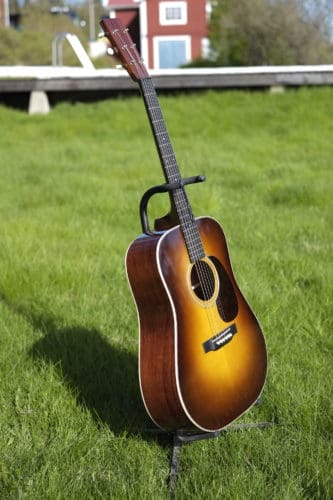 PM: It all started in 2010 when I was visiting a friend in Stockholm. I had been learning to play for about a year on a guitar that I borrowed, so I wanted to get my own. I knew I wanted a dreadnought so I tried all I could find. At a store where I tried at least 15 guitars a guy from the staff notices that I was only trying dreadnoughts, so he handed me a guitar and told me to try it. It was an old, pretty beat up Martin. I knew Martin was a good brand but knew nothing about the vintage ones. I played a G major chord and fell in love. My budget was about 10,000 SEK [~$1,200] and most old acoustics I’d seen for sale were around 2,000 SEK–I thought I was going to have plenty of money left over. I told the guy that I wanted it. He replied, “That’ll be 400,000 SEK [~$49,000].” The guitar was a ’37 Martin D-18. I had to continue my search but didn’t find a single guitar that could compare to that old Martin. So I thought that if no one else makes it, I’ll just make it myself. That’s the first time I thought about building my own guitar.