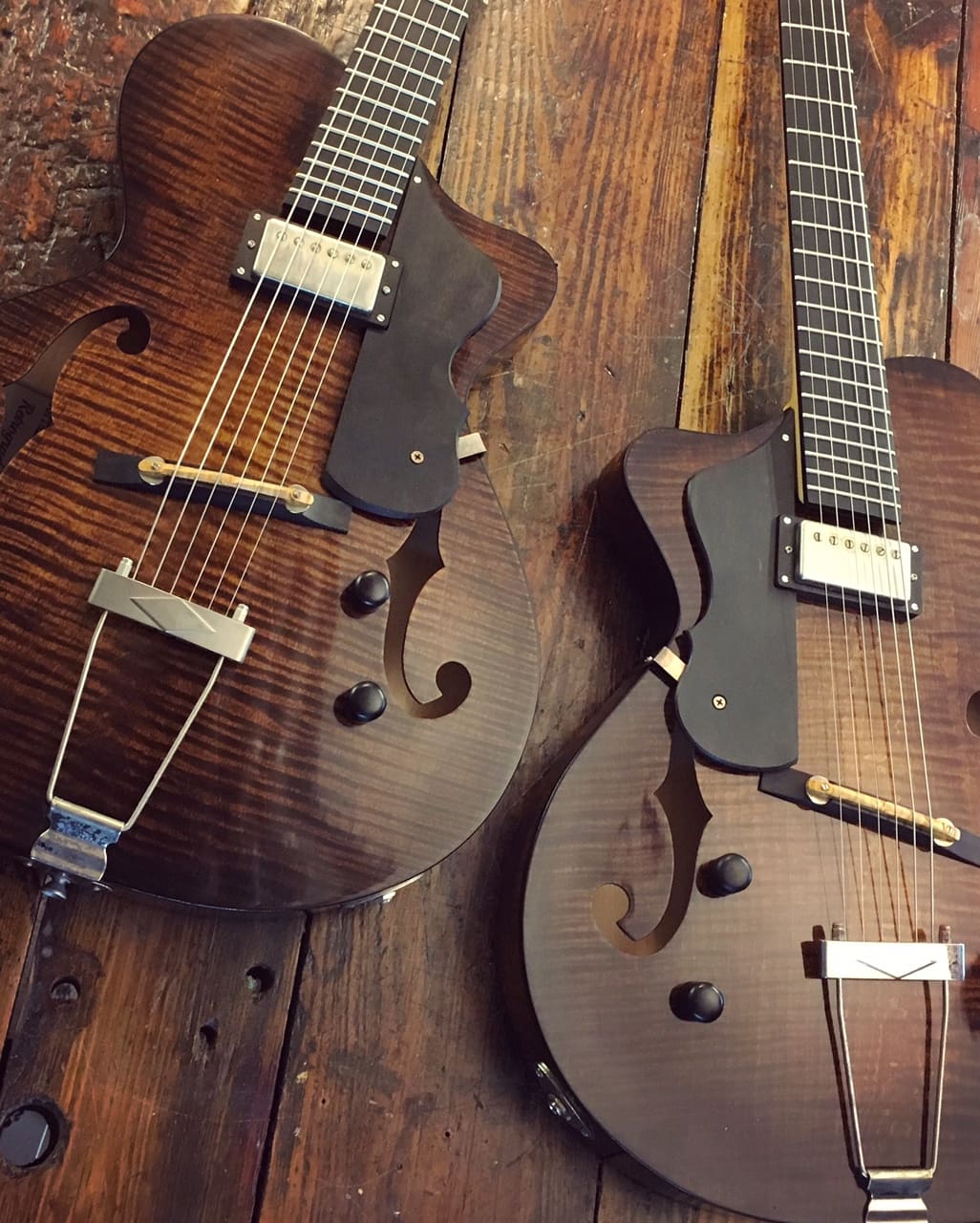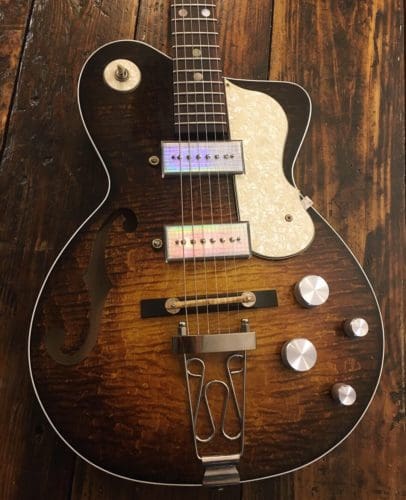 Glenn Nichols: Right now, I’m putting the finishing touches on a Retrograde Cambridge model. This one features two “Kleenex Box” style single coils by Mojo pickups from the U.K. The look is loosely based on an old Kay Barney Kessel model. Although it looks funky, the tonal range reminds me more of the first three positions on a Strat. It’s not what you would expect, and that’s exactly what I like about it.