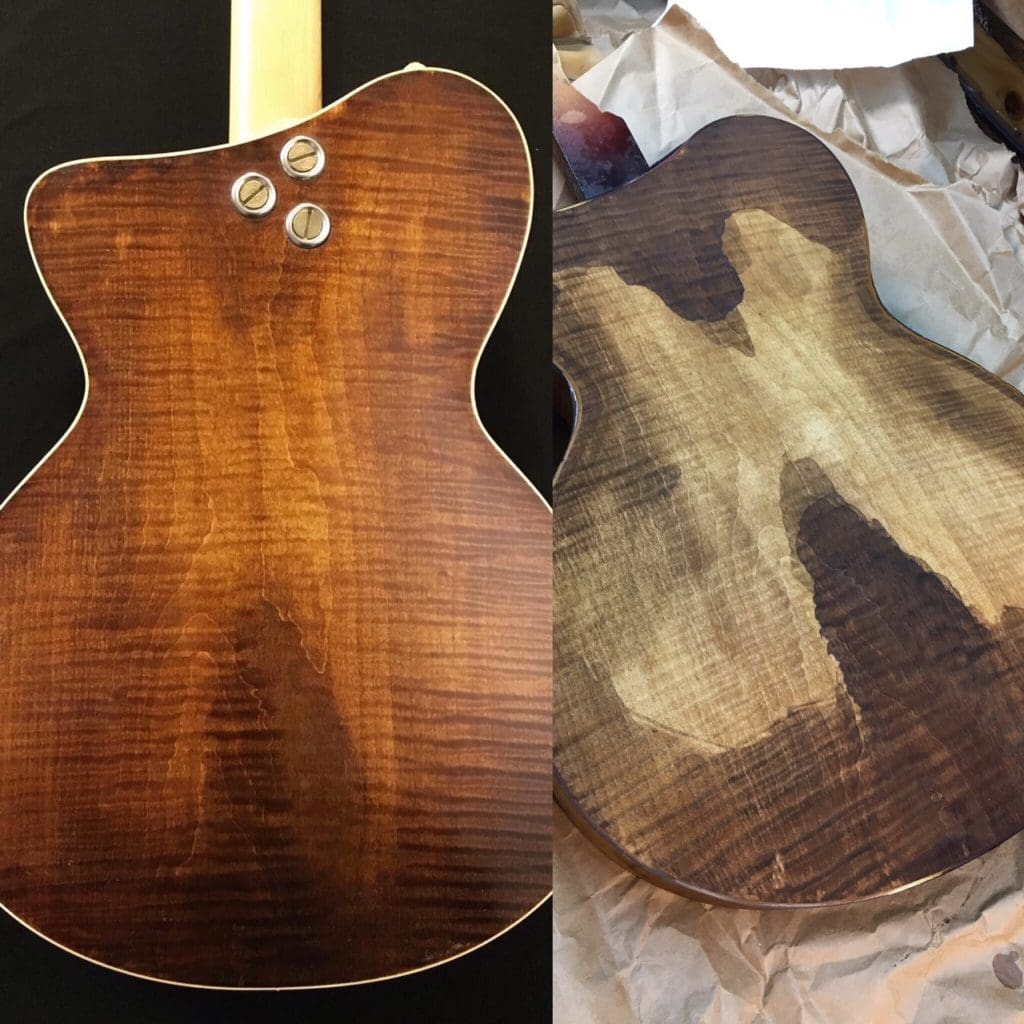 If you asked me this question six or seven years ago I would have said, “A great finish is 5 mil thick, with no shrink back or blemishes. It has to reflect like a mirror, and shine like a million suns. Please don’t touch it.” But over the years my approach has changed. For me a great finish is inviting, and makes you want to pick up the guitar. It makes you want to feel it with your fingers, and smell it, and wonder how it happened. It has to tell a story. I want it to be textural and painterly, and make the player feel comfortable, and at ease. I want to make an instrument that inspires musicians to create, not a trophy to keep in a case. I want the finish to wear as you play it, and break in like an old pair of boots. When you walk into my shop, I want it to smell like an artist’s studio, not an auto body shop.