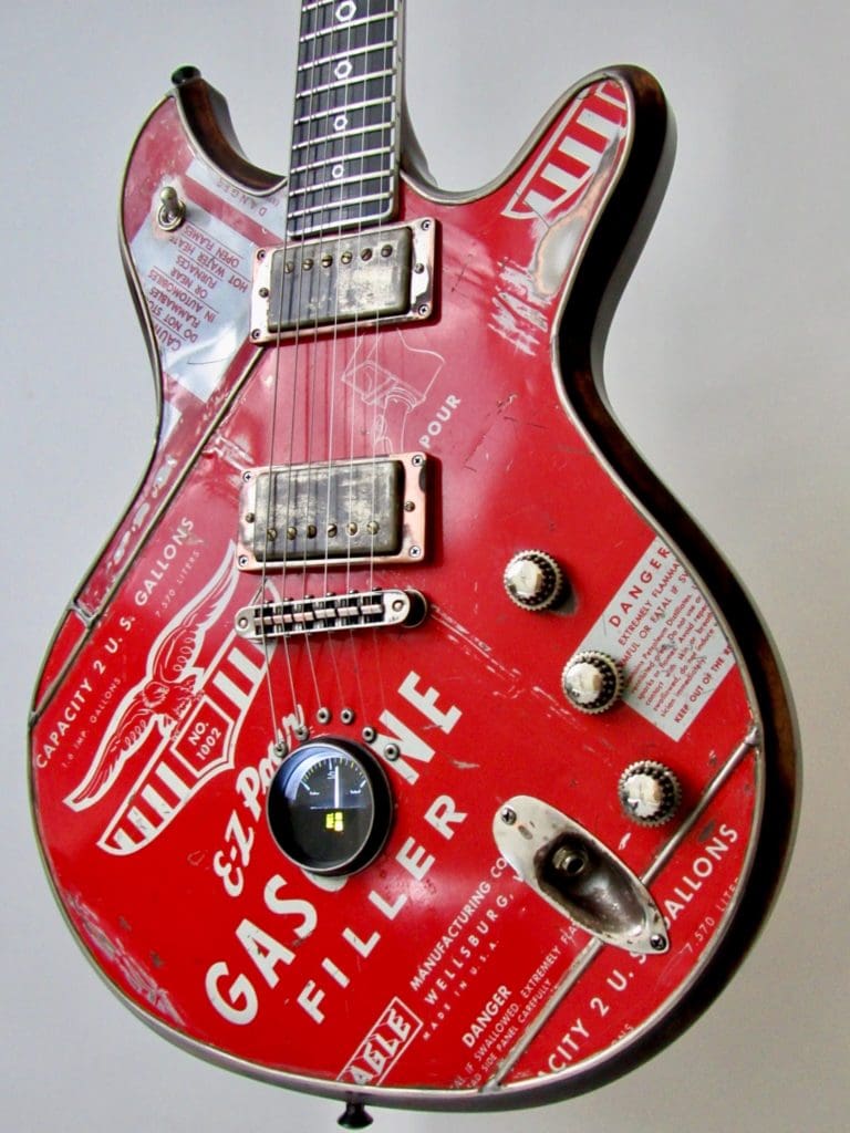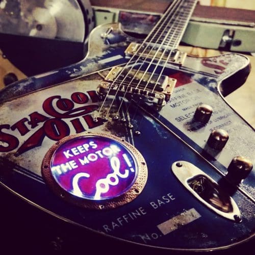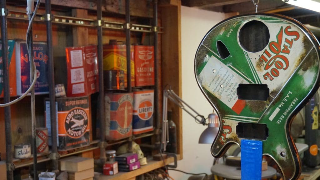 SM: I get inspired by patinas and textures. I could be driving and see an old freight train that is rusted and weathered and think, “That would make a killer finish for a guitar!” For instance, our Fuel Series guitars are modeled after old oil cans from the ’30s and ’40s. Back then, they had these incredibly cool graphics that you can’t find today. Most of the old cans have some degree of rust and wear. Our Sta Cool model is a recreation of this look. I also get inspired by the music I’m listening to while building.