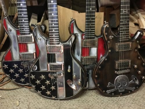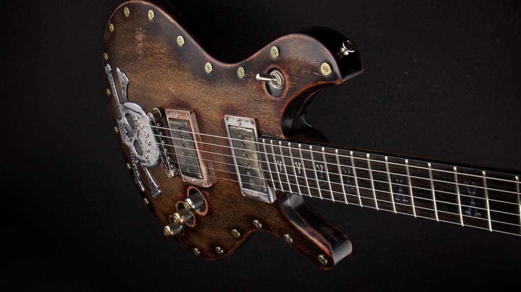 SM: We are cooking up some cool new designs that will be introduced at Winter NAMM 2018. I have so many concepts rattling around my brain that it would take years to execute them all. One crazy idea I’m experimenting with is a combination of a traditional flamed maple top relic’d to reveal industrial metal (like our machine model) underneath the surface. I’m presently calling it “Cyborg”–part-human, part-machine.