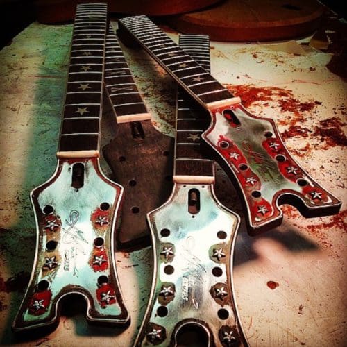 SM: I’ve always loved reusing/repurposing materials. I think that if the underlying construction of the guitar is top notch, you can use about anything to build it. One of my favorite sounding guitars I built was made from the wood of an old skateboard ramp and a 2×4 Coca-Cola pallet! I was visiting Slash at his rehearsal space once and he gave it a test drive in disbelief that I was able to make plywood sound that great! I’m also a big fan of the combination of traditional mahogany with lightweight aluminum/metal. Most of our models have some layer of metal on top, providing a warm, bright tone in combination with the rich mahogany foundation. A lot of folks think our guitars are all metal at first glance then can’t believe the tones they get and familiar playability of the models once they take a test drive.