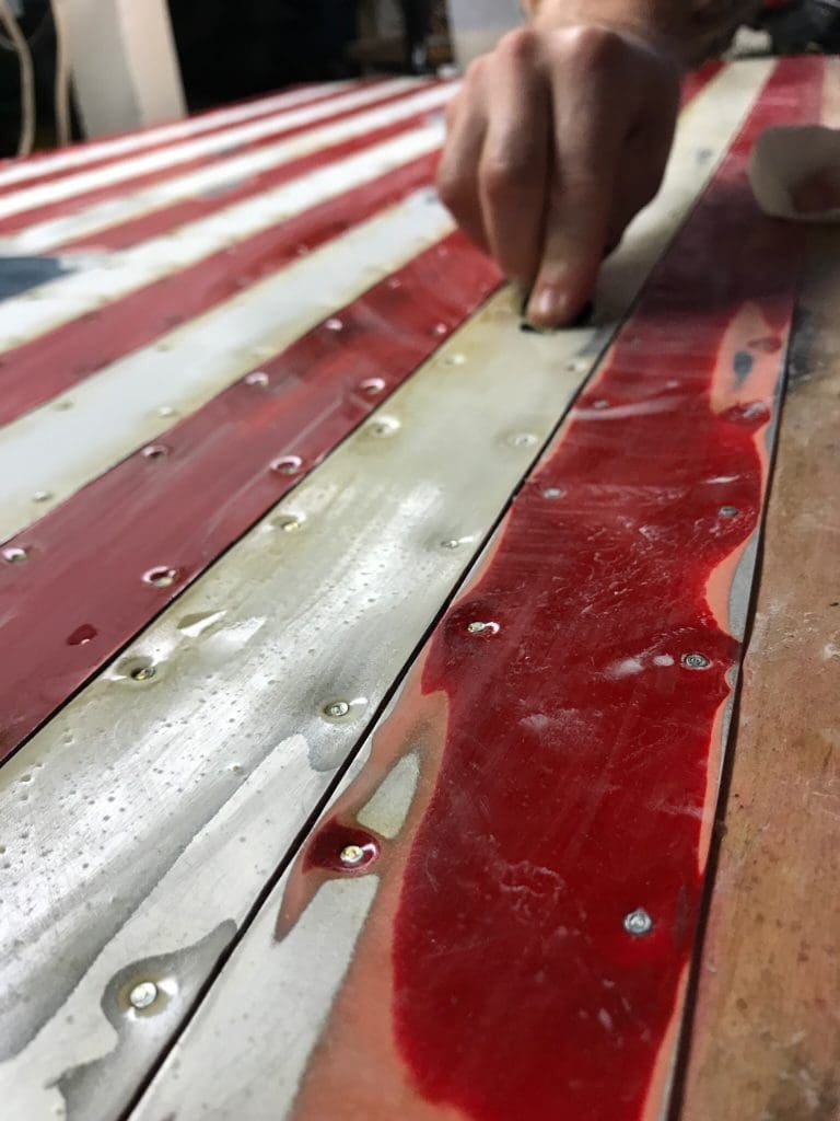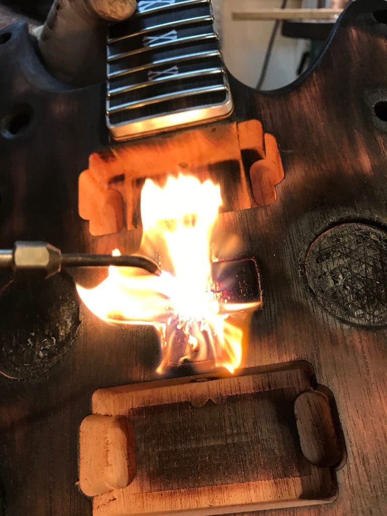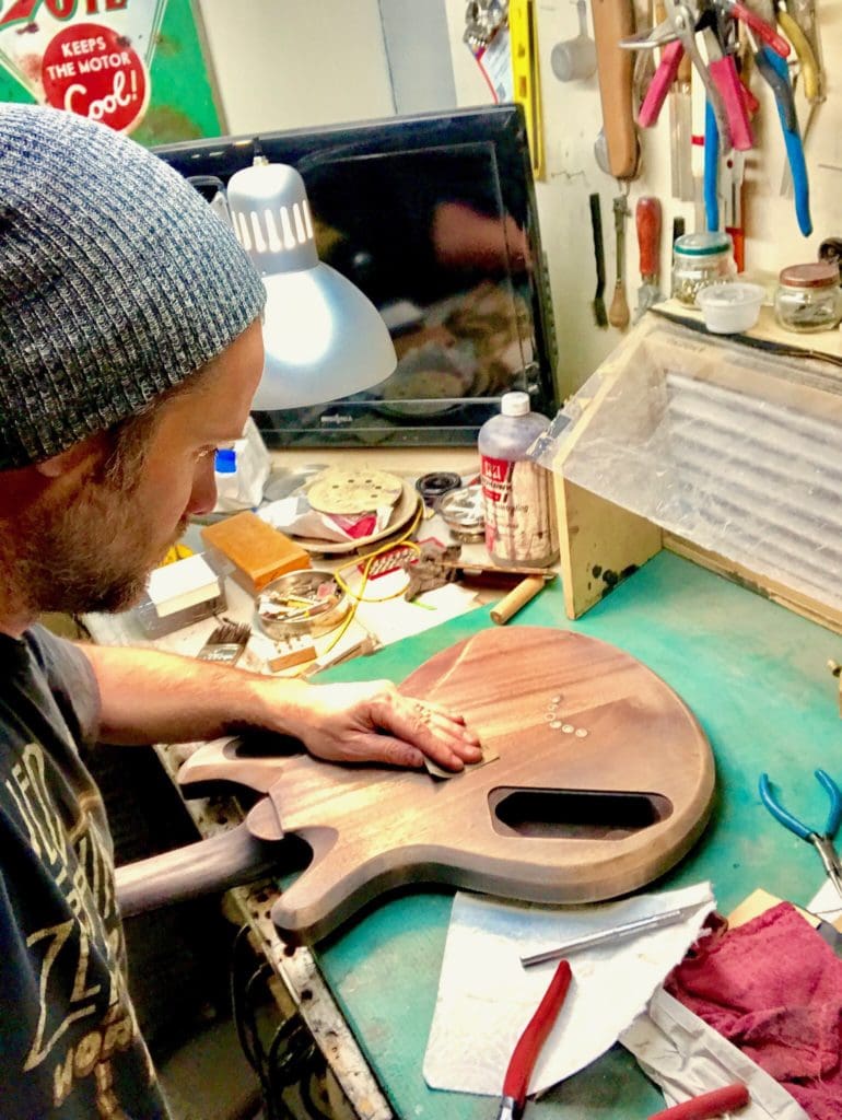 SM: Honestly, the metalwork takes much longer than the woodwork! Our patented “Tone Layer” (the metal binding with the thin layer of metal underneath the fretboard) adds a ton of resonance to the guitar and it is quite time consuming to install… but well worth the time. Then, there’s the metal that goes on the top of the guitar. It has to be fastened to the body, seamed, painted, distressed/aged and then polished! Time-wise, it’s like building two guitars.