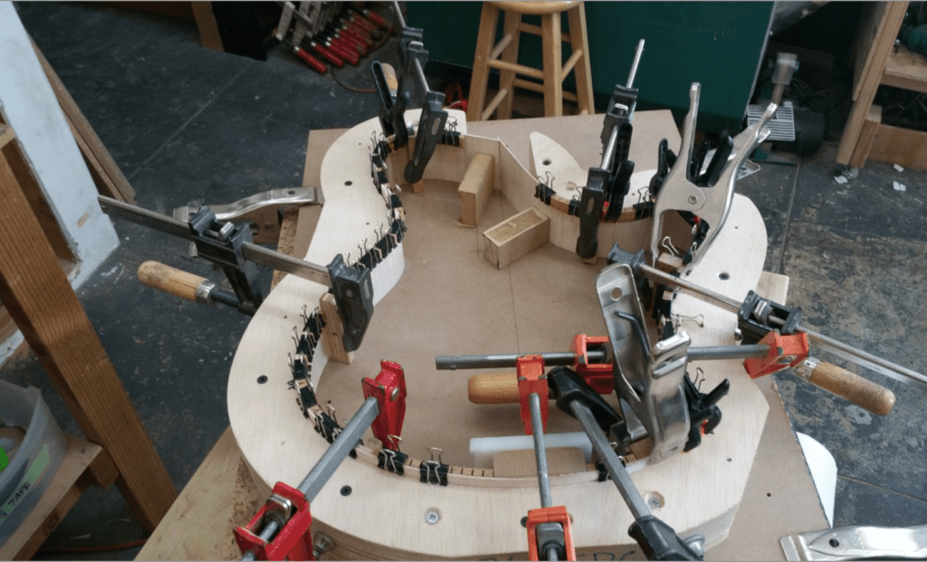 Another guitar that’s coming up is one of my ergonomic design archtops, but as a 12-string headless version. The ergonomic design archtop was a huge departure from anything I would have ever thought to make. I got a request for one several years ago by a player working in Asia, and designed it from scratch for him from a napkin sketch! I’m pretty adventurous as far as trying new designs and I was pretty stoked to do it. I had never given any thought to ergonomic design guitars, but discovered there’s a whole subculture of guys that are really into it… think: the Steinberger-type crowd. The guitar really works, it is super comfortable to play and as far as I know there are only a couple archtop builders that have tried it out and offer it. Along the way, several other players have seen the guitar and ordered them, too. Every now and then I get to do one, but the 12-string version will definitely be a challenge and a unique project.