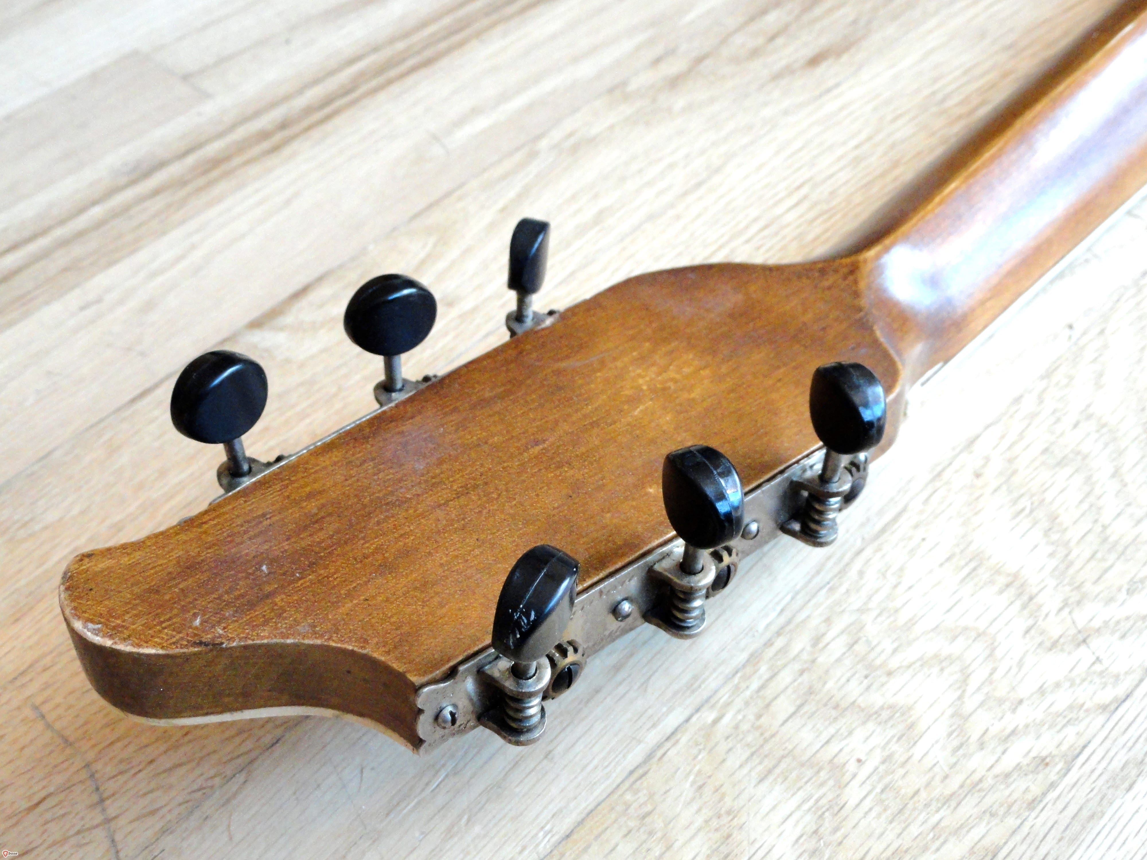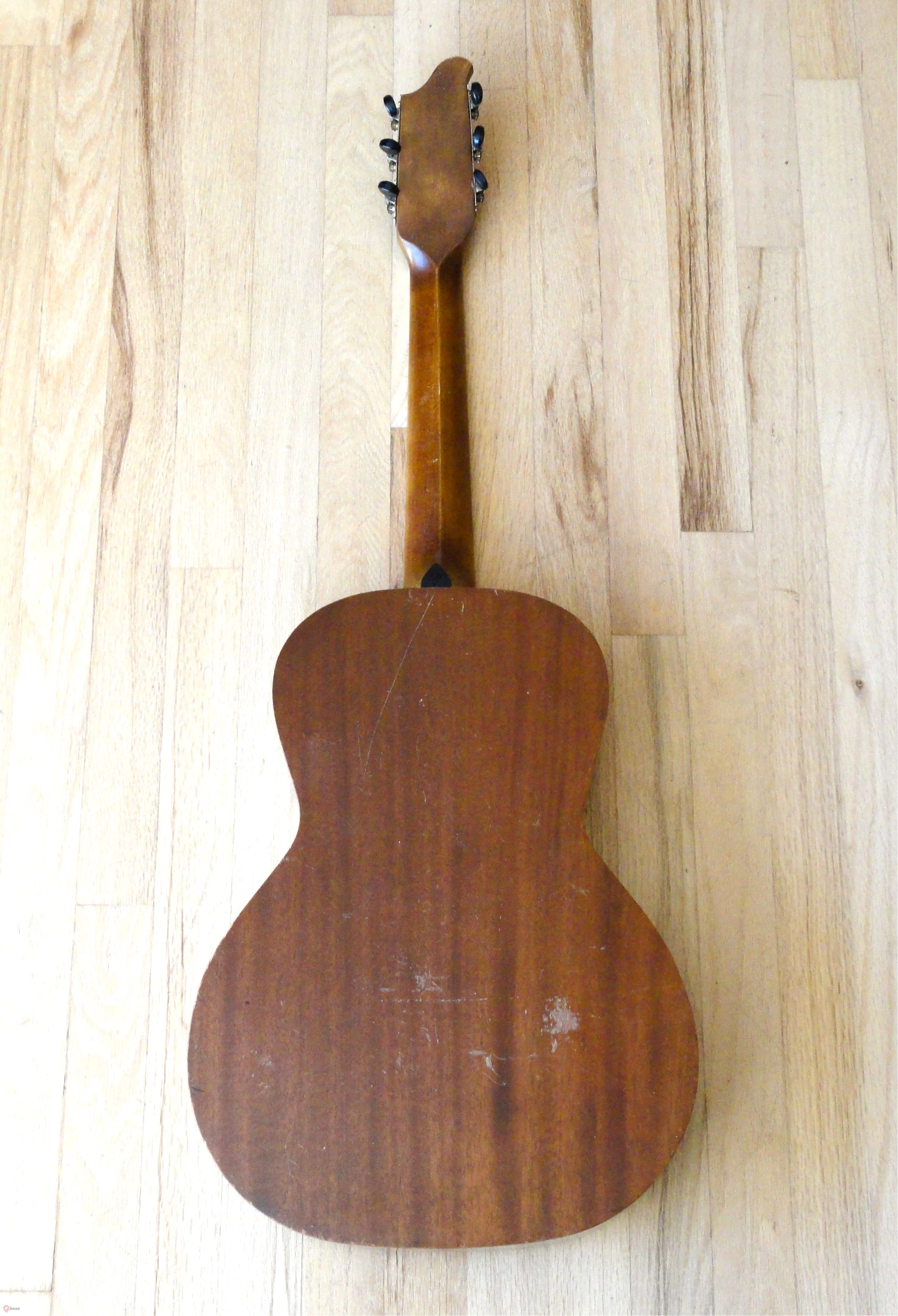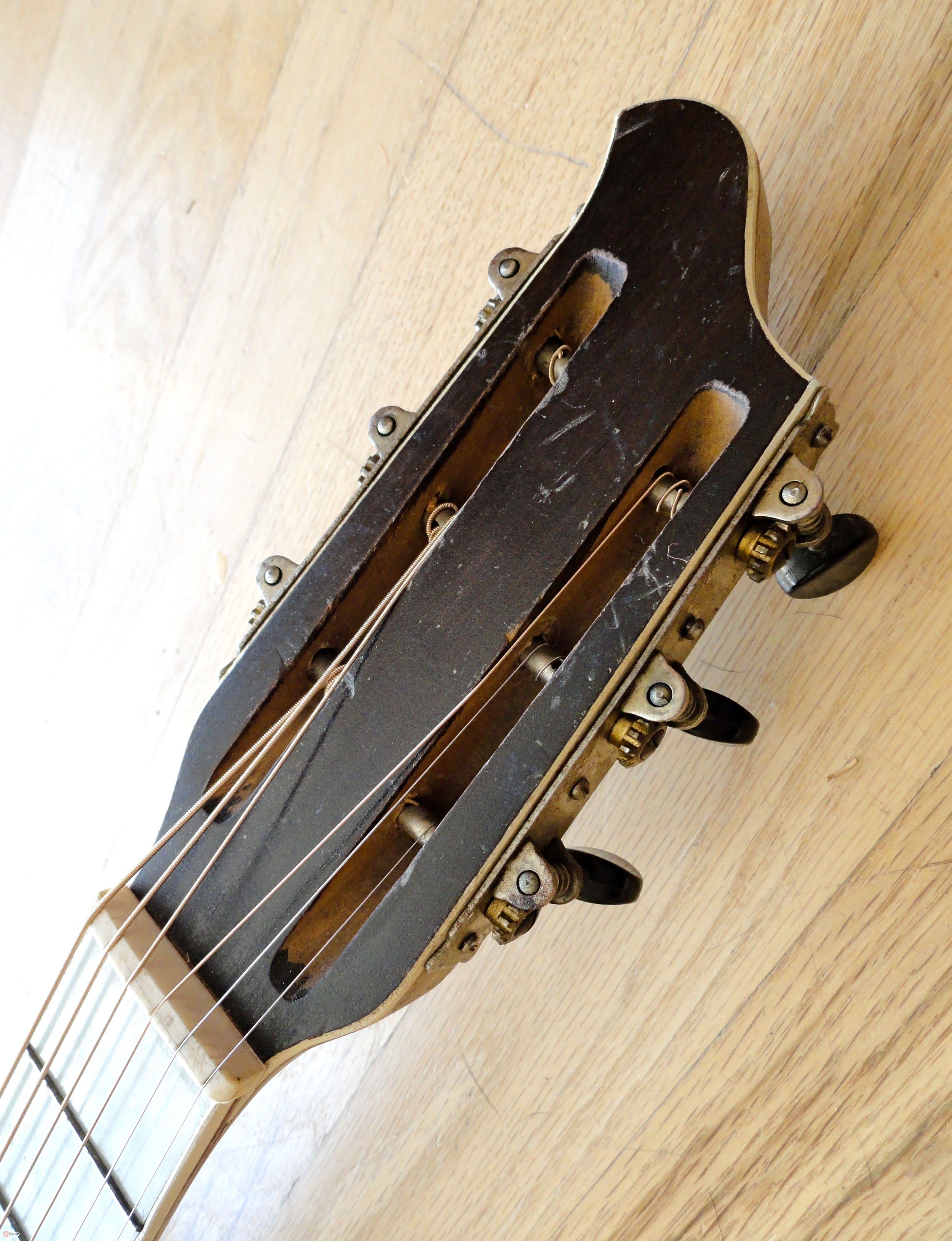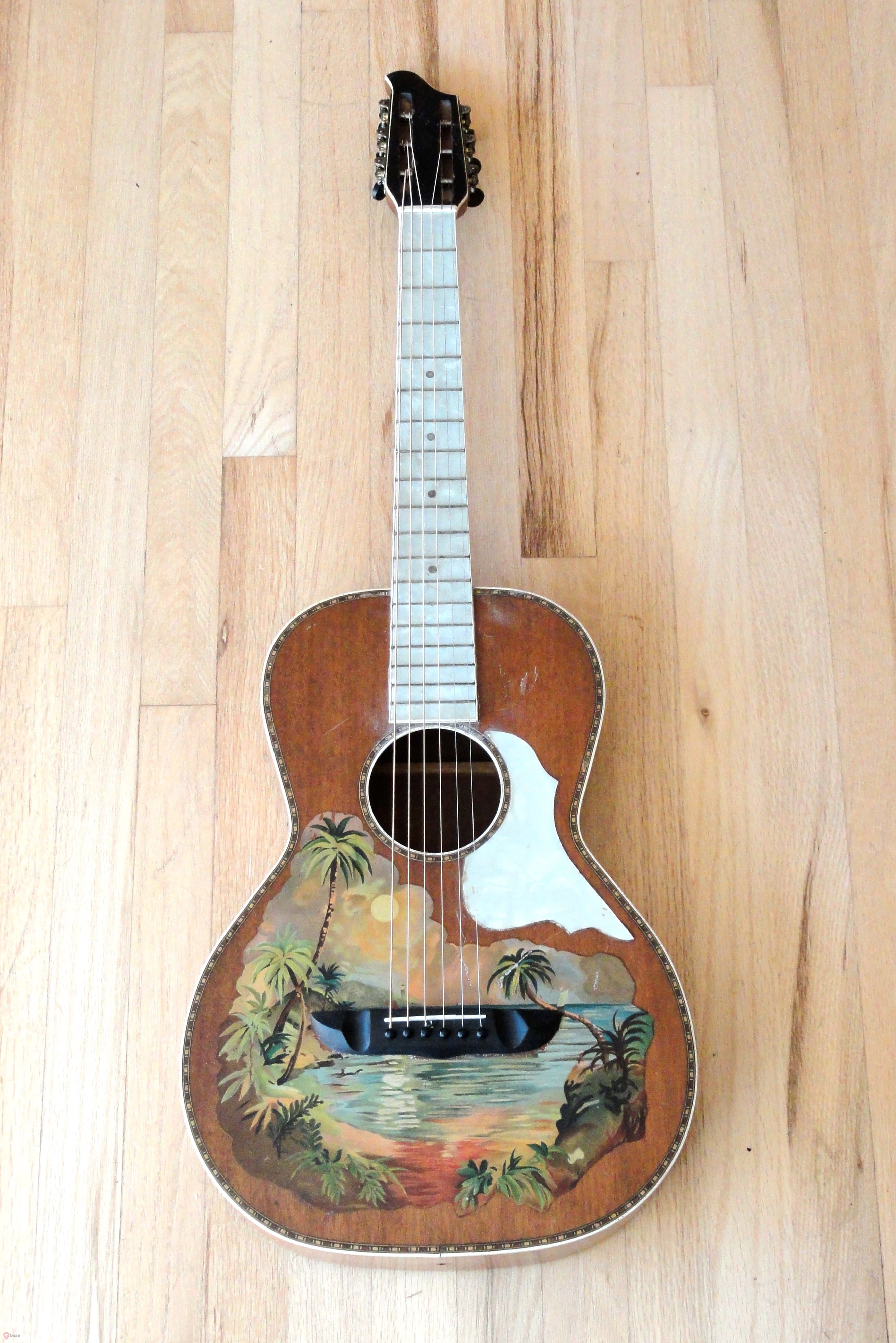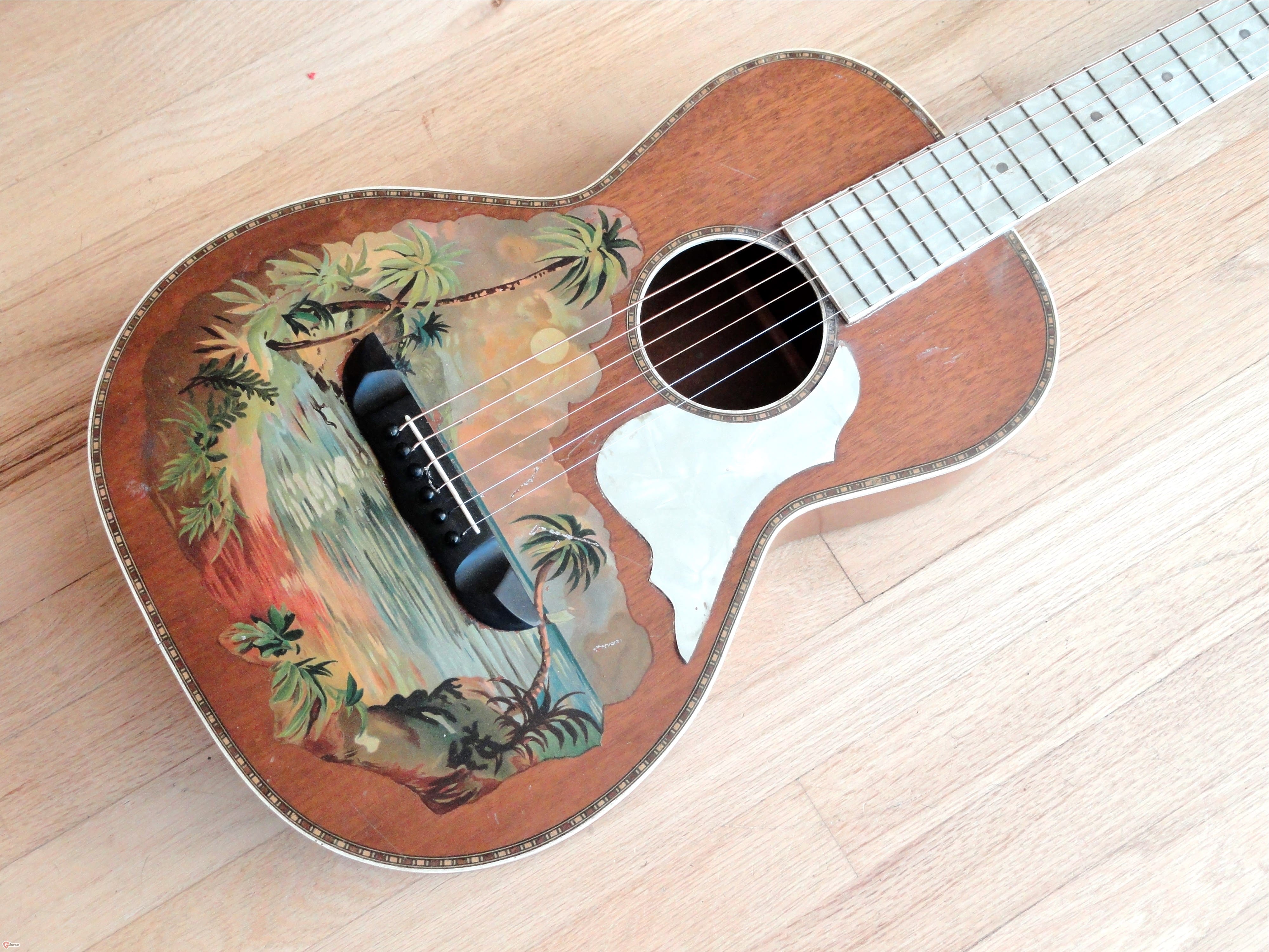 Stromberg-Voisinet was one of numerous companies that built fretted instruments in Chicago in the early part of the 20th century. Like Regal, Harmony and most of their other competitors, Stromberg-Voisinet made relatively inexpensive instruments that were designed to be sold through catalogs. 1920s Stromberg-Voisinet instruments were very well made, given their cheap prices, and they generally had a unique approach to design. Today’s Catch was made sometime in the mid-1920s, at the height of America’s infatuation with all things Hawaiian. (You can read how Stromberg-Voisinet became Kay in 1931 here.)