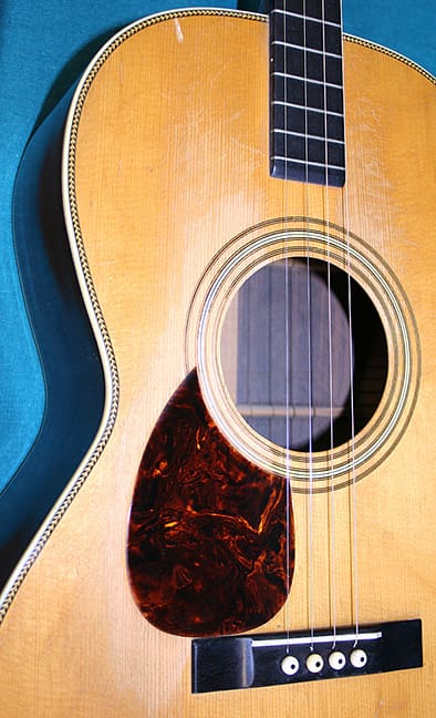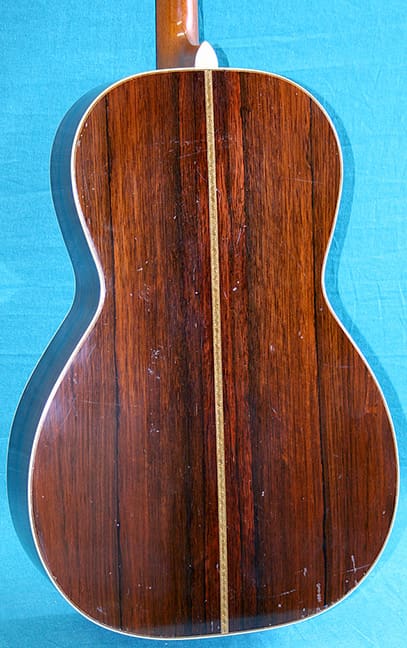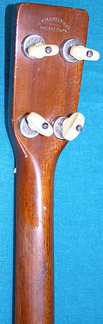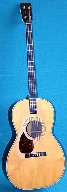 The plectrum guitar, on the other hand, was a flop. The plectrum guitar had a long scale length of around 26 inches, and it was usually tuned to CGBD. It was possible to tune it to DGBE, the top four strings of a guitar, but because of the long scale the strings had to be very light and consequently plectrum guitars tended to not have much volume with that tuning, a real drawback if your were trying to provide rhythm for a dance band. Still, if you are playing in a small group, they can sound very good. Over the years Martin built more than 10,000 tenor guitars in various styles but they built fewer than 450 plectrum guitars, and most those were between 1928 and 1934. To add to the general rarity of plectrum guitars, Martin only made 19 1-28Ps and of those, I suspect only one of them was a lefty. So, this particular 1-28P is the rarest version of a very scarce model of an obscure guitar style. It was built during Martin’s Golden era, which means that it probably sounds great, but how many left-handed plectrum guitarists are there out there? If you are one of them, and have $5300 burning a hole in your pocket, I do believe Intermountain Guitar and Banjo has the guitar of your dreams.