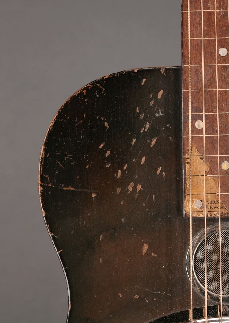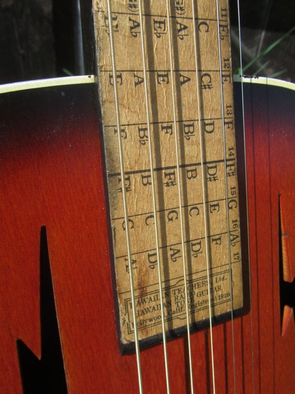 Here’s a portion of an intact paper overlay from another guitar. From this sample we can see that the Hawaiian Teachers of Hollywood taught the A Major Low Bass tuning, a tuning that was popular with some of the earlier Hawaiian guitarists like Sam Ku West, Benny Nawahi and Sol Hoopii. By the end of the 1930s, wooden Dobros were associated with country players rather than Hawaiian guitarists. Country players tended to tune to open G, so I suspect that a Josh Graves acolyte peeled of the paper to keep from getting confused. (I gleaned the tuning info from Slide Rules Andy Volk’s great little book on tunings for lap steel, pedal steel, bottleneck and Hawaiian slide guitar. If you play any of these styles you need this book.)