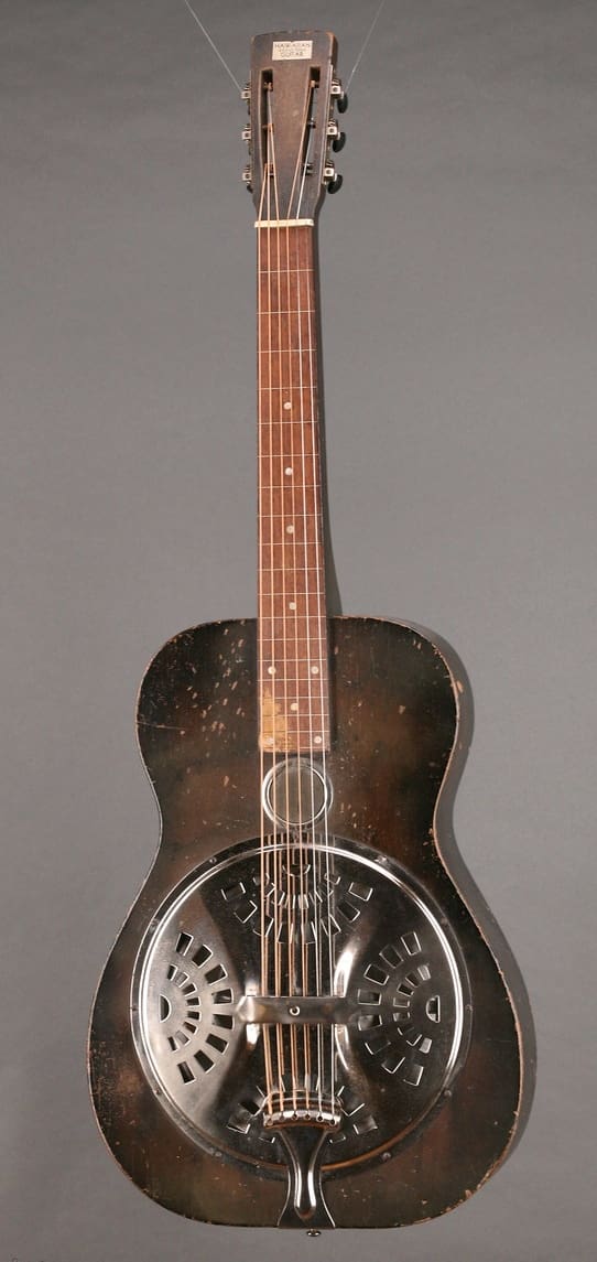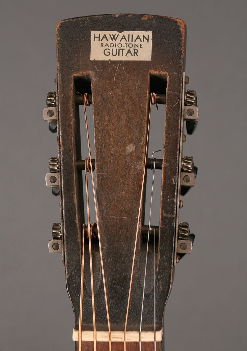 The headstock may say Hawaiian Radio Tone but this guitar is Dobro through and through. Back in the 1930s, with the Great Depression slowing down sales, just about every guitar company made instruments to order for department stores, regional wholesalers or, in the case of this squareneck, music schools. This instrument was ordered from Dobro by an outfit known as the Hawaiian Teachers of Hollywood who were in operation from the early 1920s to sometime in the 1940s. Usually Hawaiian Radio Tone guitars were very cheaply made hollow necks that vaguely resembled Weissenborns but from time to time a much better instrument, such as this Dobro, shows up bearing the company’s name. This guitar looks like it was made in California around 1933, and it closely resembles the Dobro Model 27, which is generally known as the Cyclops for its single soundhole. The Model 27 was a modestly priced guitar and it usually came with a plain finish but this version has the fancy faux rosewood paint job that came on the Model 45.