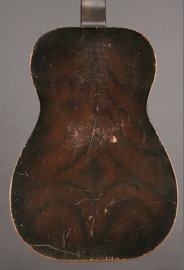 The rosewood grain pattern on the back of this guitar was painted on. The actual wood is proabaly birch, which is a very pale wood.