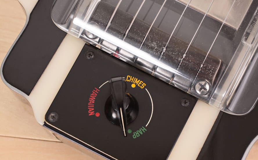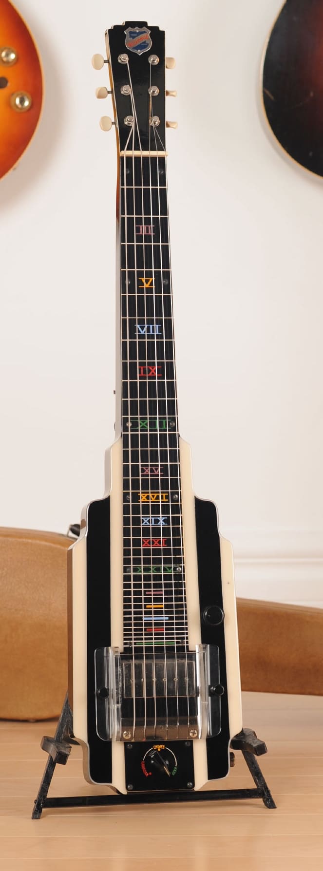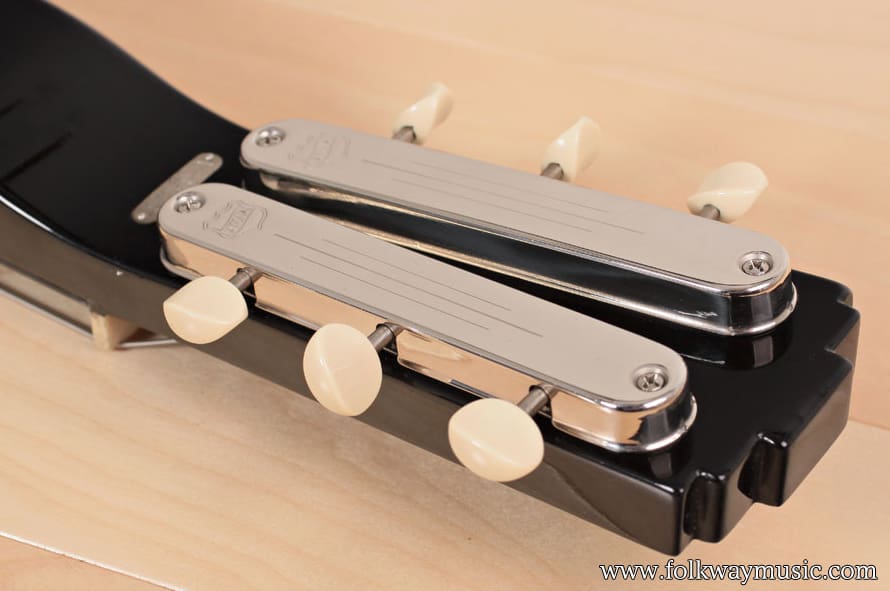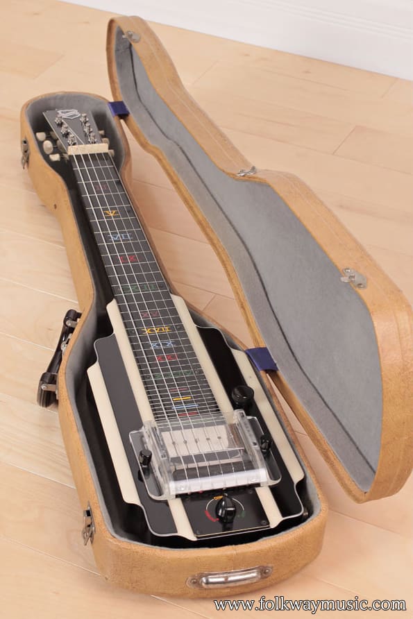 A while ago we looked at a 1962 National New Yorker lap steel, a double pickup version of today’s Catch. (Click here to read about the guitar and some of National’s very complex history.) I’ve always liked the Art Deco look of the New Yorker, which is very stylish. This is the one guitar that pretty much requires a musician in a tuxedo to play it. This particular example was made in 1947 and the store selling it got it from the original owner, a woman named Betty, who was a music teacher in the 1950s and 1960s. She must have been a very fastidious person because I don’t think I’ve ever seen a vintage guitar that was this clean. I like every feature of this guitar, from the stairstep headstock to the Plexiglas pickup cover, which is a holdover from National’s World War II stint making windows for bombers. But I especially like the tone control, which rather than adjusting the treble and bass, claims it goes from Hawaiian to Chimes to Harp. The New Yorker is a good sounding guitar, and this a model that looks really good hanging on the wall. This pristine example is priced at $995 and it’s for sale at Folkway Music.