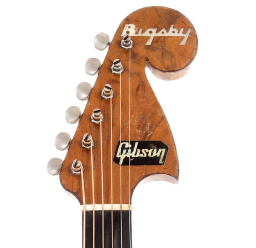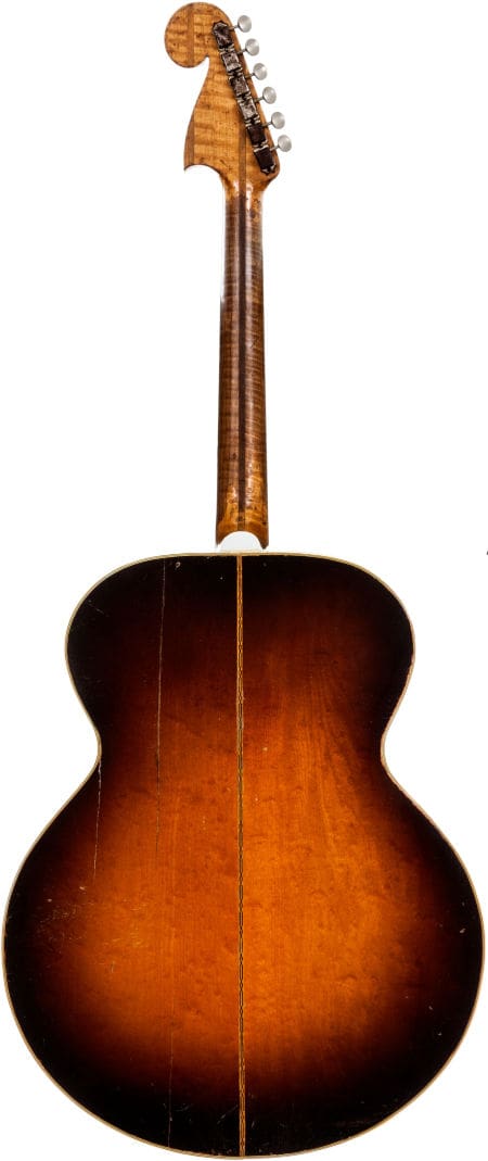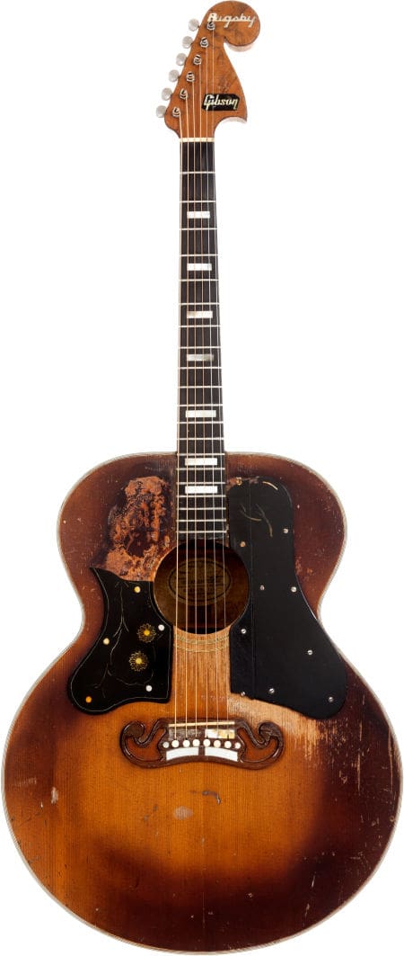Anyway, back to the guitar. Like many of his more famous country music friends, Dewey Groom had Paul Bigsby make a new neck for his acoustic guitar. (Here’s a great clip of Deke Dickerson playing Lefty Frizzell’s Bigsby-necked J-200.) Like most of the other renecked acoustics, this J-200 this neck is made of maple, very fancy maple in this case, topped with the distinctive Bigsby headstock. I like the way that Bigsby used both his name and the Gibson inlay from the original headstock. The guitar body itself looks like it has seen better days, but that is to be expected from an instrument that has spent a lot of its life in a honky-tonk. Neither pickguard is original and I suspect the guitar has been refinished. This Gibson J-200 is going to be auctioned off on February 15, 2014 by Heritage Auctions. The opening bid is set at $10,000, but I suspect it may go for more than that so you’d better start saving your pennies.