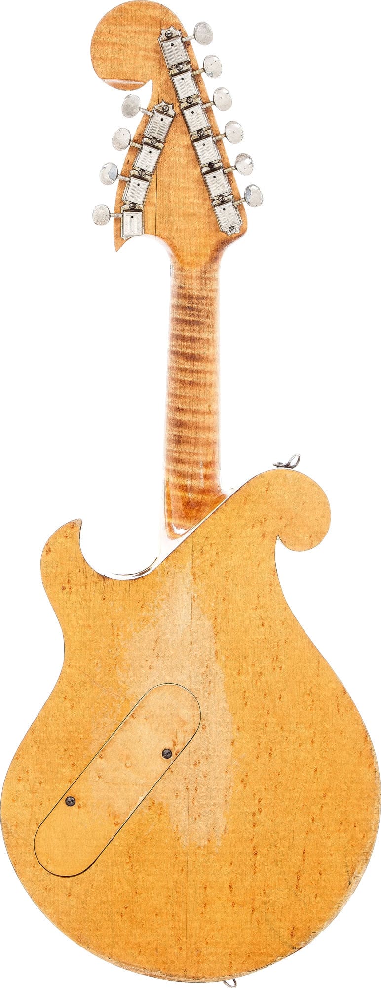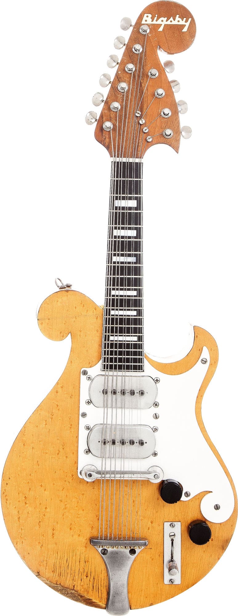 Muessig’s mandolin has ten strings, two more than a standard mandolin. Usually in this setup the extra pair is tuned down to C, which actually makes it a sort of mandola/mandolin hybrid. It also has custom wound pickups with five pole-pieces, a very unusual configuration, even today. Happily, Bigsby was a skilled craftsman who was equally at home working in wood or metal, which made it simple to make parts like these from scratch. Bigsby instruments rarely come up for sale but during the rare times that they do, they sell for fortune. (The last Bigsby guitar to sell at auction went for almost $250,000 and there are rumors of them changing hands privately even more than that.) This mandolin is scheduled to be auctioned by Heritage Auctions on February 15 with an opening bid of $20,000, but it will most likely go for much more than that.