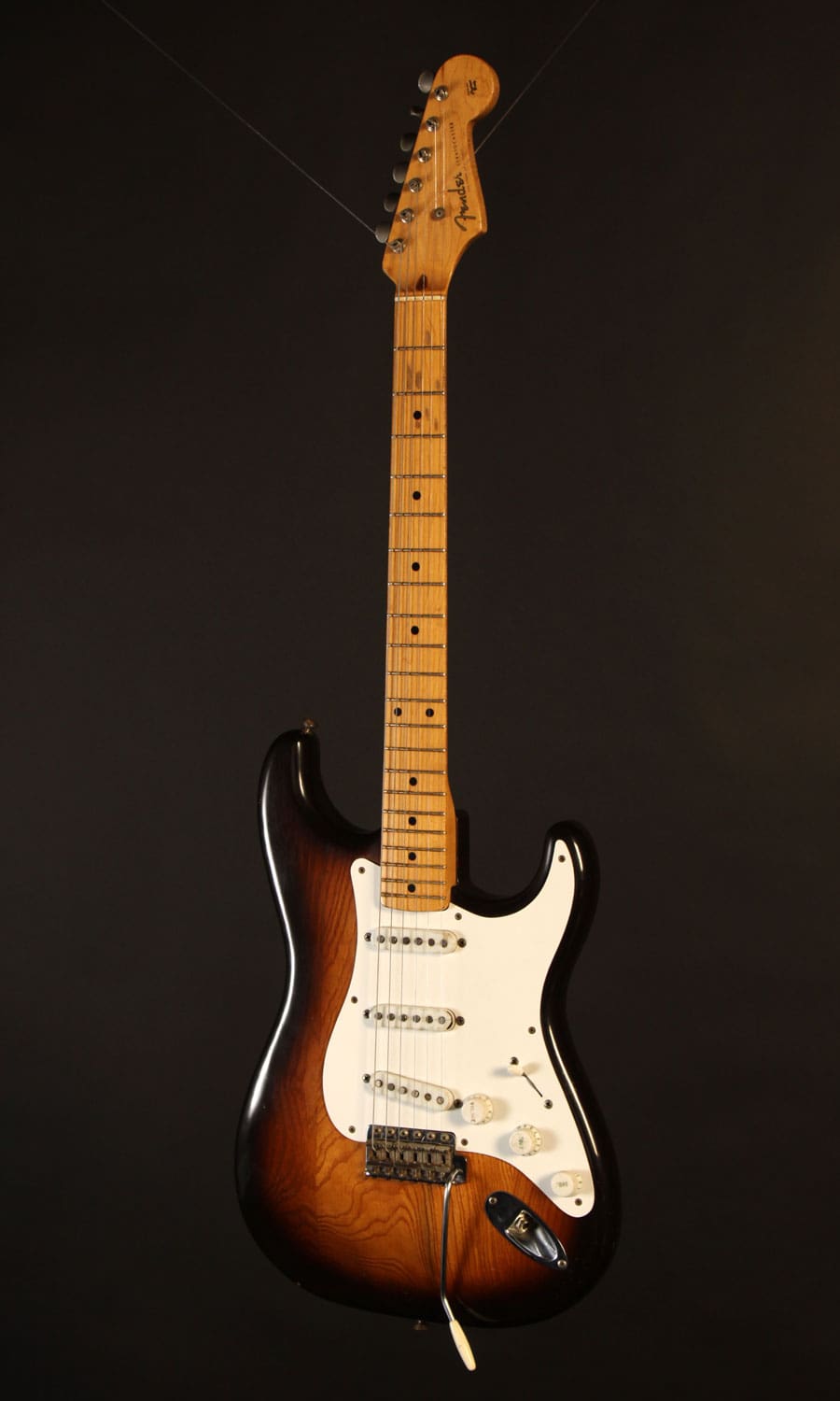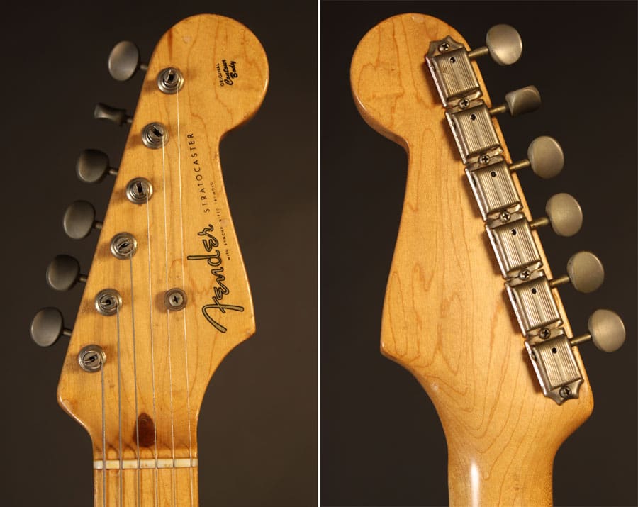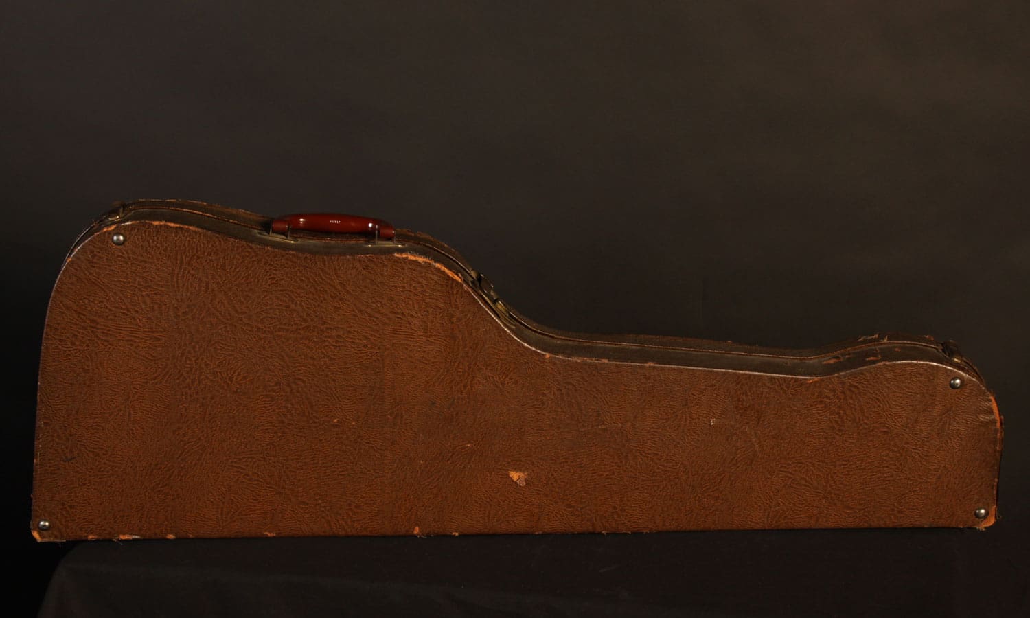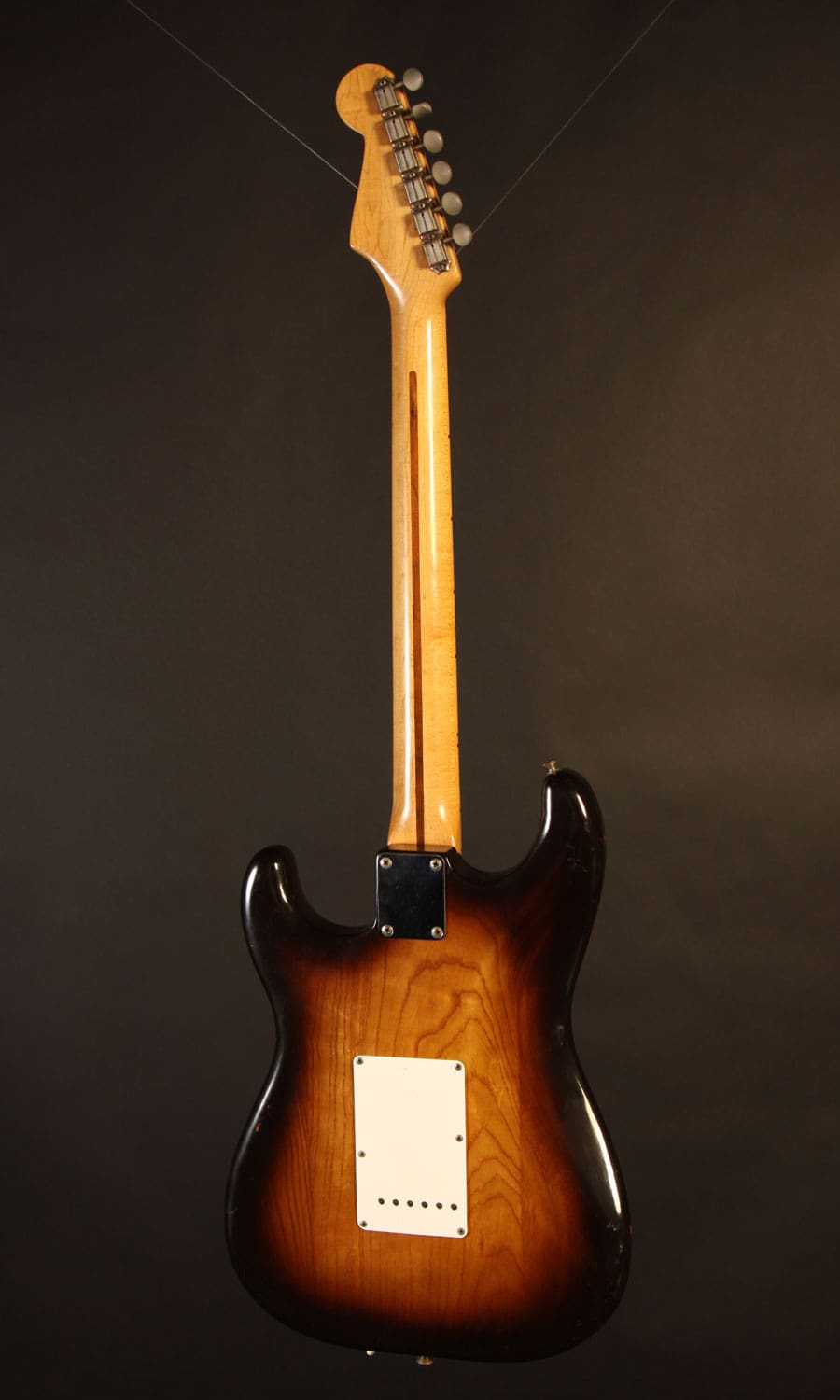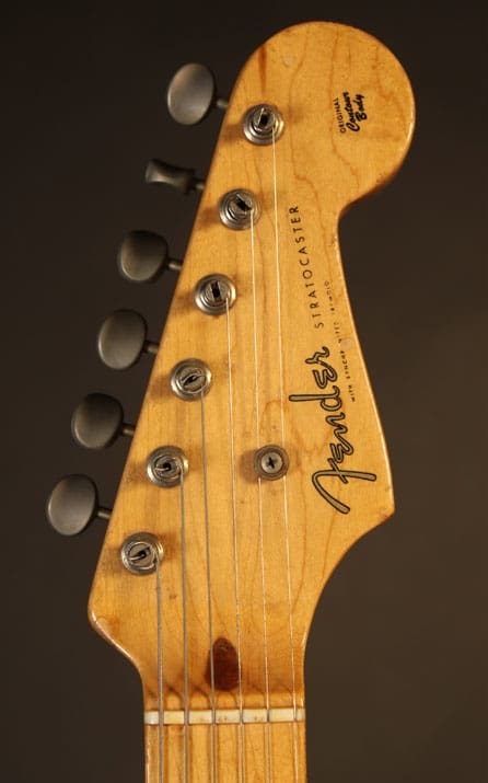 This Fender Stratocaster bears the serial number 0100 and a body date of April, 1954 making it the earliest known example of the model. Yep, this is perhaps the very first production Strat making it more than just the Catch of the Day. Whoever winds up with it will have the Catch of a Lifetime. This guitar is from a small batch that was made in the spring of 1954 and it was sold to a store in El Monte, California, who in turn sold it to a now unknown musician. Whoever that unknown guitarist was, he most likely wasn’t a full-time professional because he sure kept this guitar in great shape. It only has minor wear on the fretboard and some tiny nicks and scratches on the body. The original yellow to black sunburst is in fine condition and hasn’t faded at all, which suggests to me that it spent most of its life in its case. (And yes, it has its original poodle case and it’s in great shape, as well.) If this guitar could could speak it would probably say, “I spent most of my life under the bed. How boring is that?”