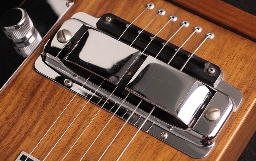 “The Jerry Byrd models were short scale steels (22.5″), the scale length Byrd considered to be the optimum to facilitate his style of slant bar playing. Jerry Byrd models came in 6-string versions, like this one, as well 7, 8 and 10-string configurations with 10-string models being the rarest. Those horseshoe pickups are unbeatable. Like the early Fender Dual Pro steels, the strings go through the center of the magnetic field. Steelers talk about the tone of the Rickenbacker pickups in terms of “growl.”