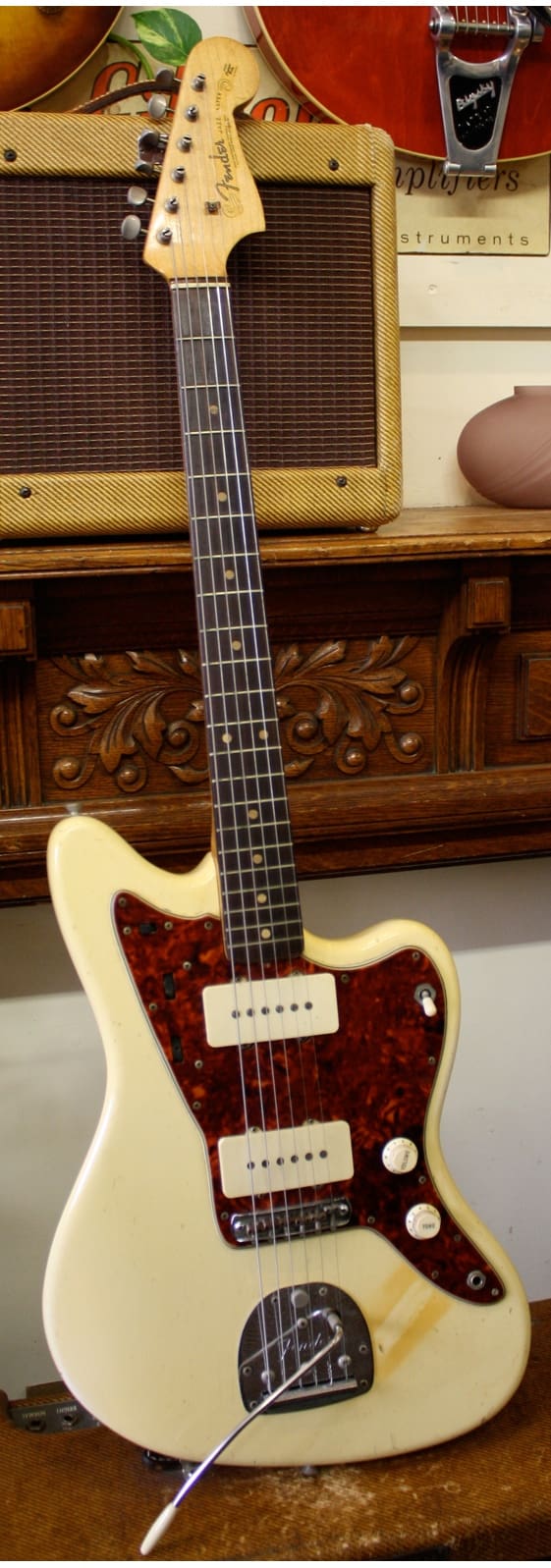 This 1963 Jazzmaster is finished in Olympic White, a relatively common custom color. Over time, as the lacquer has aged, it has given the guitar a nice ivory tint. (It’s also possible that cigarette smoke has added to patina.) Apart from the dark stain down by the tailpiece, this guitar is in very clean original condition. If the Jazzmaster has a flaw, it’s that the saddles on the bridge are a bit too shallow and if you are an enthusiastic player the strings pop out of their slots pretty easily. Happily, there is an easy, non-invasive fix for this issue, the Mastery Bridge. Normally, I wouldn’t recommend swapping out the original parts on a vintage guitar, but the Mastery Bridge is such a huge improvement and it’s easy to switch back to the original. Everyone I know with a Jazzmaster uses one. Anyway, if you’d like to jump on the Jazzmaster bandwagon just send $4950 to Lark Street Music and they will help you make the leap.