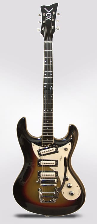 The other day I wrote about a very nice 1963 Fender Strat, so today I thought I’d take a look at one of the many guitars that the Strat inspired. Vox was an English company that got their start making amps in the late 1950s but they soon expanded into the guitar making business. Their first guitars were made in the UK but by 1966, the year this Bulldog was made, they were having their guitars made in Italy by EKO. Even though it has a different headstock shape than Fender’s and the slanted pickup is in the neck rather than the bridge position, the body shape and general vibe scream Strat. For a long time guitars like this were derided as pale imitations but in the last few years players have come to realize that guitars like this are well-made and have a sound all their own. And they usually sell for quite a bit less than Fenders. This Bulldog, for example, is hanging on the wall at Retrofret but it can be yours for a mere $1350. That’s a great deal for someone looking for cool vintage guitar.