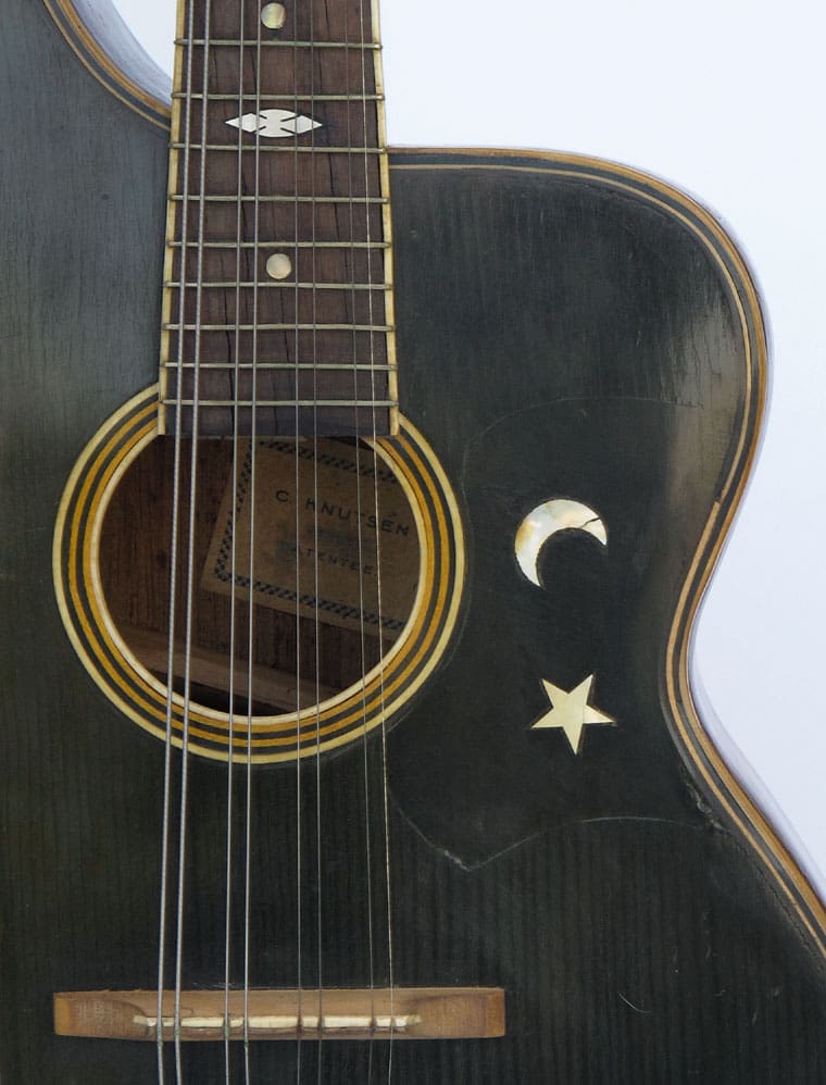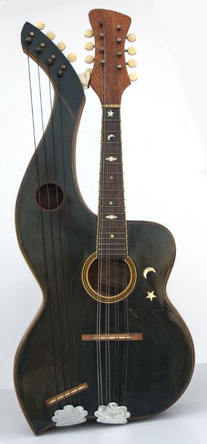Along with guitars, Knutsen also built ukuleles and mandolins, including the lovely ebony example here. Usually, Knutsen’s mandolins had the extended body but only five of them are know to have the extra sub-bass strings. I’m not sure how useful the extra strings are on a mandolin. Harp guitarists tend to play fingerstyle and use their thumbs to hit the bass strings. But mandolinists use a flatpick and to my mind the typical tremolo technique would make difficult to hit the bass strings. But if you want to prove me wrong you can send $5500 to Harp Guitar Music and work out the technique. For more info on harp mandolins, harp ukuleles and harp guitars, head on over to Harpguitars.net. Make sure you set aside a large block of time. There is enough amazing information to keep you intrigued for hours.