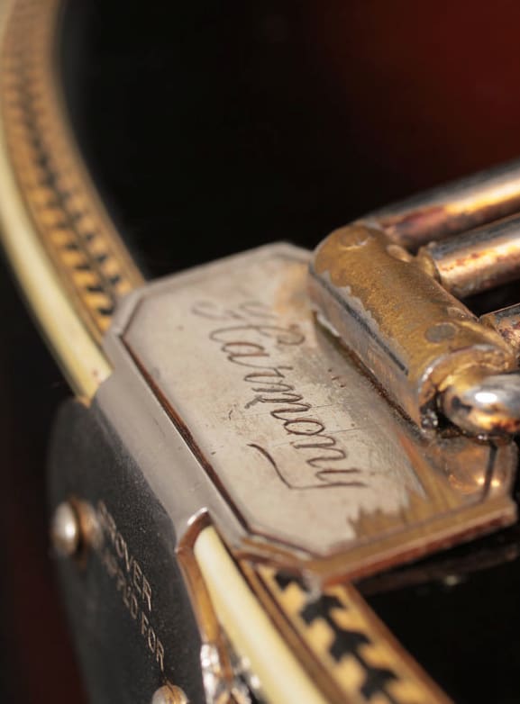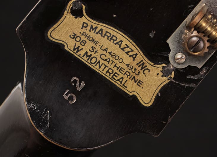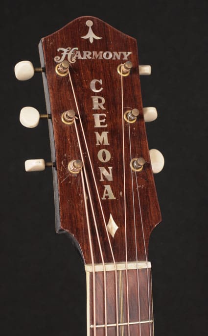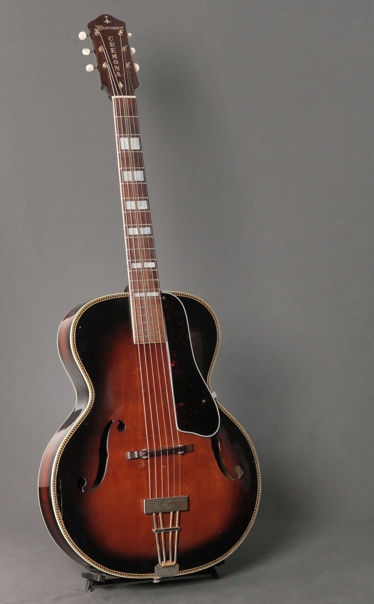 At one point in its history Harmony was the largest builder of fretted instruments in America. The company was based in Chicago and was owned by Sears. Consequently Harmony made most of the instruments called Silvertone and Supertone, Sears’ in-house brand names. Much of Harmony’s output was slated for sale through the Sears catalog, which was mailed out to millions of potential customers in the early part of the 20th century. But they also made plenty of guitars under their own name that were sold to music stores across the country. As with the instruments made for the Sears catalog, most of Harmony’s guitars were very inexpensive, with many of them selling for less than fifteen dollars. But they also made a few higher quality guitars such as the mid-1930s Cremona VII seen here. This guitar had a list price of $75 in 1935, $25 dollars more that Gibson’s budget L-50 but quite a bit less than Gibson’s top of the line Super 400, which sold for $400. The Cremona VII had a carved spruce top and solid maple sides and back. It also had herringbone trim, which was more of a flattop style of ornamentation, but I think looks nice here. Most Harmony guitars really don’t sound very good but I’ve played quite a few Cremonas over the years and I think that sound pretty good. They don’t have the punch and power of a Gibson or an Epiphone, but they aren’t chopped liver, either. This particular guitar looks like it was well cared during most of its life. If you’d like to be it’s next caretaker, just send $1999 to the fine people at Folkway Music and they will be happy to set you up.