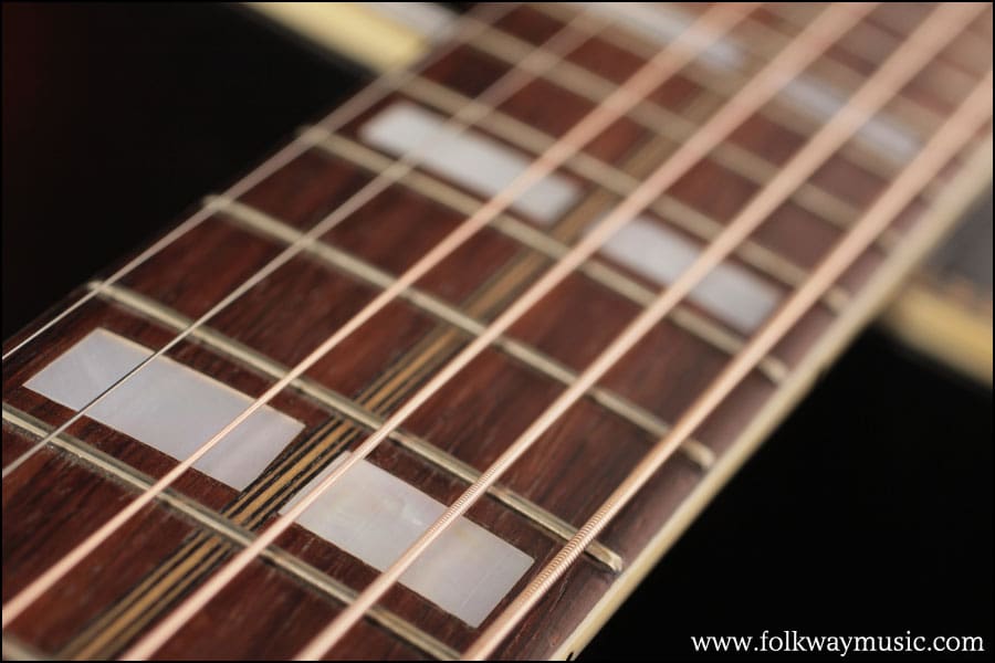 At one point in its history Harmony was the largest builder of fretted instruments in America. The company was based in Chicago and was owned by Sears. Consequently Harmony made most of the instruments called Silvertone and Supertone, Sears’ in-house brand names. Much of Harmony’s output was slated for sale through the Sears catalog, which was mailed out to millions of potential customers in the early part of the 20th century. But they also made plenty of guitars under their own name that were sold to music stores across the country. As with the instruments made for the Sears catalog, most of Harmony’s guitars were very inexpensive, with many of them selling for less than fifteen dollars. But they also made a few higher quality guitars such as the mid-1930s Cremona VII seen here. This guitar had a list price of $75 in 1935, $25 dollars more that Gibson’s budget L-50 but quite a bit less than Gibson’s top of the line Super 400, which sold for $400. The Cremona VII had a carved spruce top and solid maple sides and back. It also had herringbone trim, which was more of a flattop style of ornamentation, but I think looks nice here. Most Harmony guitars really don’t sound very good but I’ve played quite a few Cremonas over the years and I think that sound pretty good. They don’t have the punch and power of a Gibson or an Epiphone, but they aren’t chopped liver, either. This particular guitar looks like it was well cared during most of its life. If you’d like to be it’s next caretaker, just send $1999 to the fine people at Folkway Music and they will be happy to set you up.