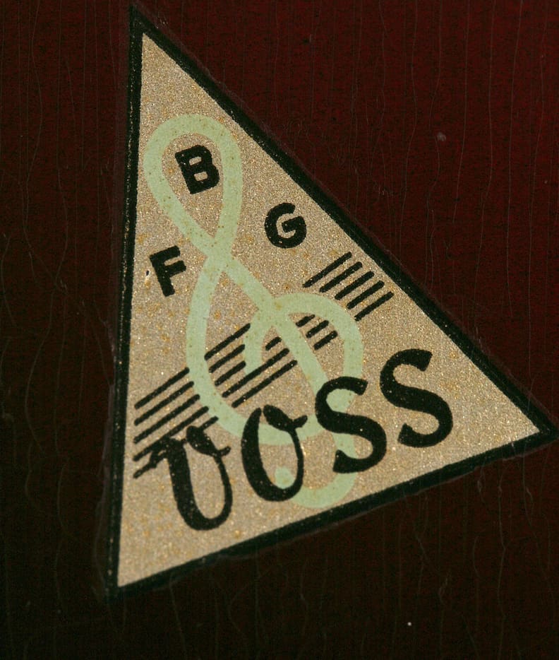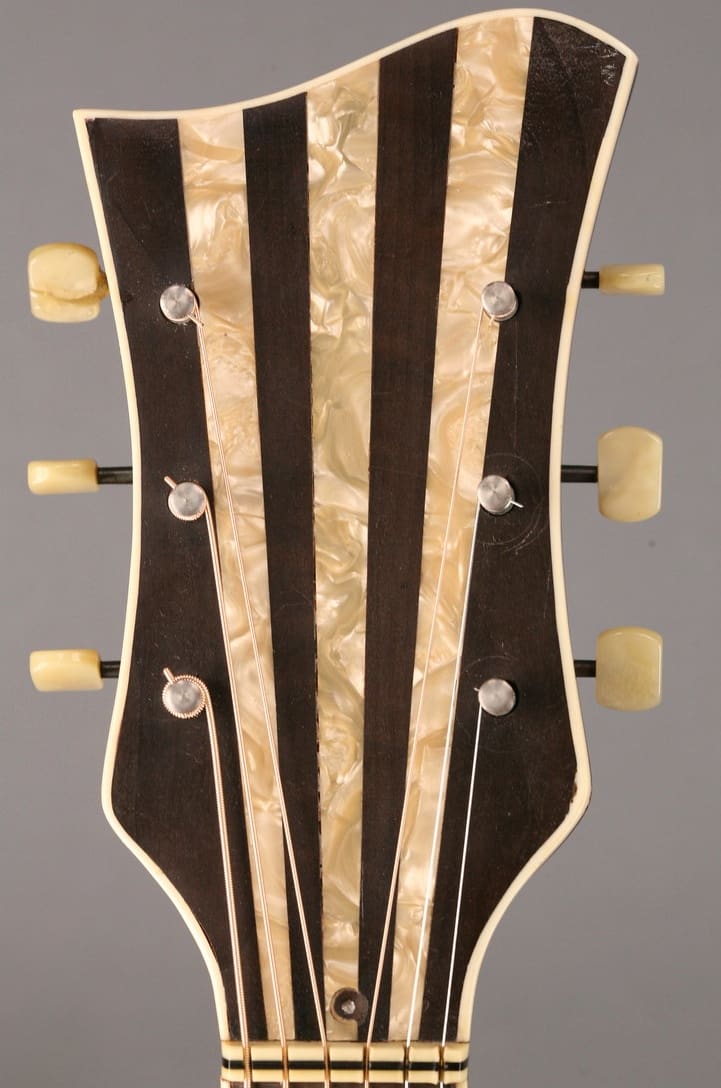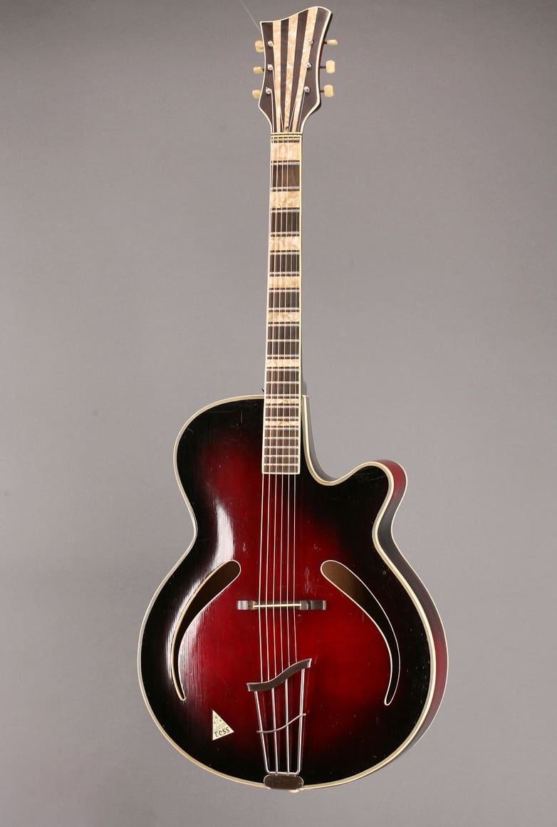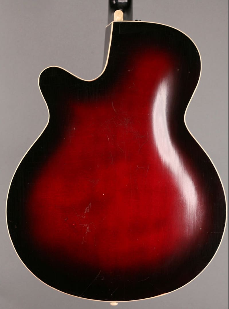 It’s good to know that there are still mysteries in this world such as this archtop guitar. We don’t know where it was made, when it was made or who made it. The best guess is that it was made in Germany, but we can’t definitively rule out Sweden either. It looks like it was made in the early 1950s, but guitars like this were made up into the 1960s. It has a Voss label on the top, but Voss was a distributor and not a builder. The German builder Klira did make guitars for Voss but this guitar doesn’t look quite like the other guitars Klira made. The headstock shape shows up on guitars made by a number of builders as does the red sunburst, so those don’t help. Lots of builders used similar art deco headstock inlays, so that seemed to be a common style at the time and not much help. The cat’s-eye soundholes turn up on guitars made by Gretsch, Hopf, Hoyer and the East German builder Perlgold, but this guitar wasn’t made by those companies.