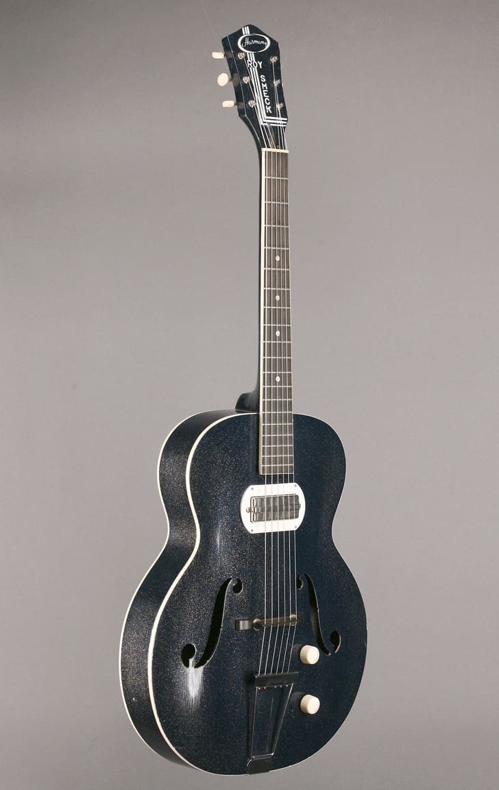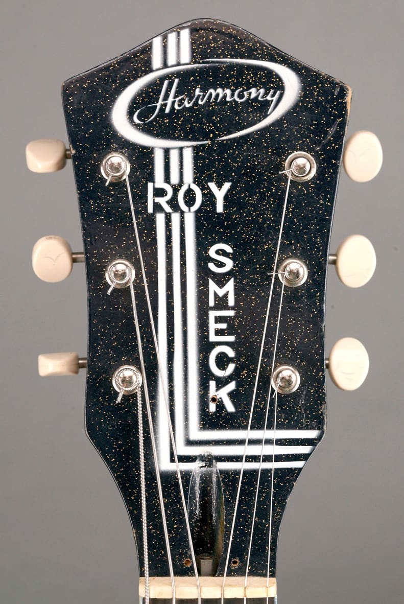 For yesterday’s Catch of the Day, we featured a 1930 Harmony Roy Smeck Vita-Guitar, a guitar that Smeck endorsed in the early part of his career. Today we’d like to feature a guitar he endorsed in the later days of his career, the Harmony H-56 Roy Smeck. Unlike the Vita-Guitar, which had a pear-shaped body and a bridge that looked like an airplane, the H-56 looks like a conventional archtop. The body is constructed of solid birch and, because Smeck was a showman through and through, he insisted it be painted a dramatic midnight blue enhanced with gold sparkles. The guitar sports, as the Harmony catalog called it, a “time tested ‘Tone-Emphasizer’ pickup.” I actually got to play this very guitar and I thought it sounded very good, with a raw, rough tone that is well suited to the blues. It’s missing its original pickguard, but as Gryphon Stringed Instruments, its current keeper, is only asking $850 for it I think that can be overlooked.