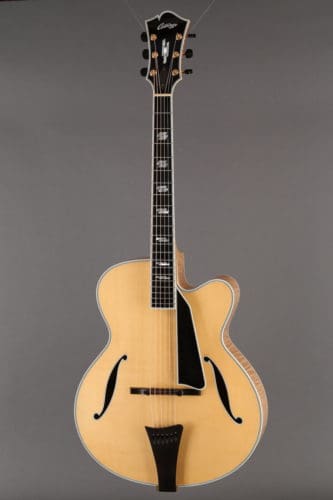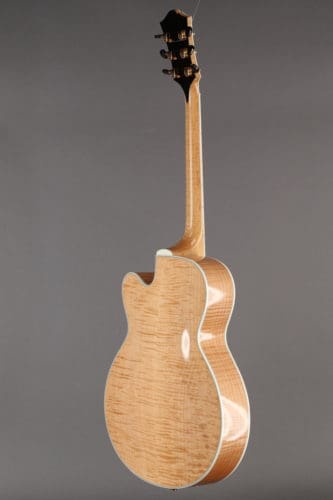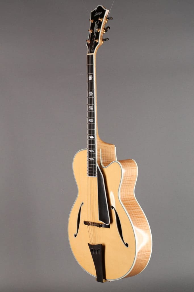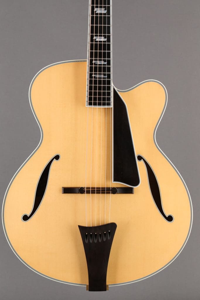 Today’s Catch is a doozie of a dazzler, a catch in and of itself, as a musical instrument, as well as a rare, collectible artifact. What we got here is a 1993 Collings AT-17 that we spotted over at Gryphon Stringed Instruments, one of the rare 17″ archtops built pretty much entirely by Bill Collings himself, completed far less frequently than the already infrequent AT-16s. It actually pre-dates Collings record-keeping; according to the company it’s one of only two or three that were built before they started keeping detailed records in 1995. It’s a full-bodied, European spruce and Big Leaf maple, natural-finished beast (with a cutaway), the likes of which Bill basically stopped building more than a decade ago.