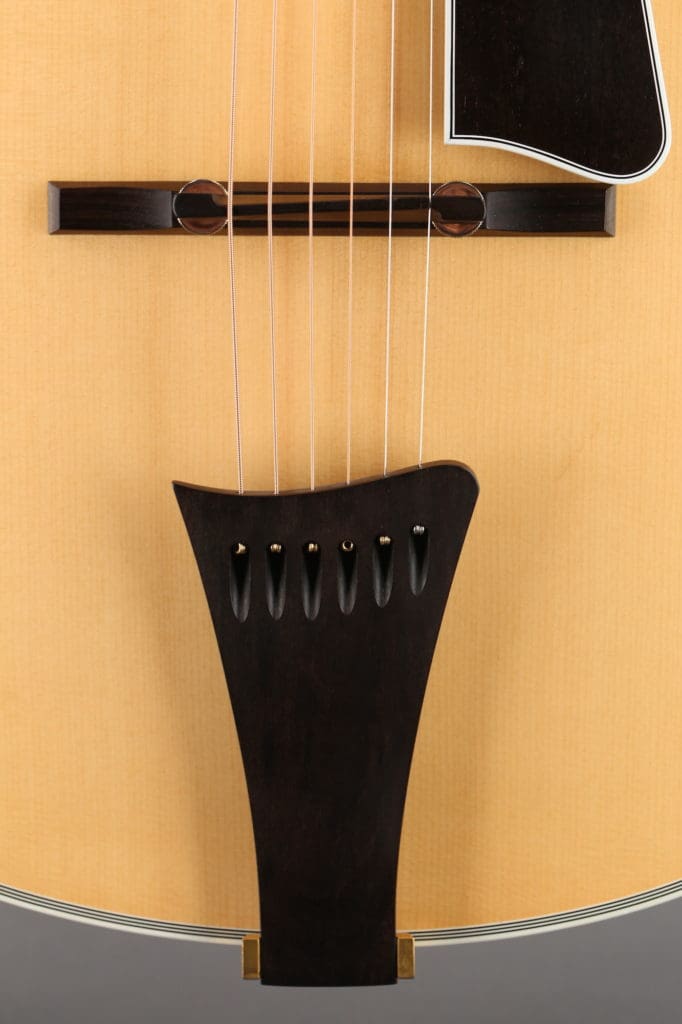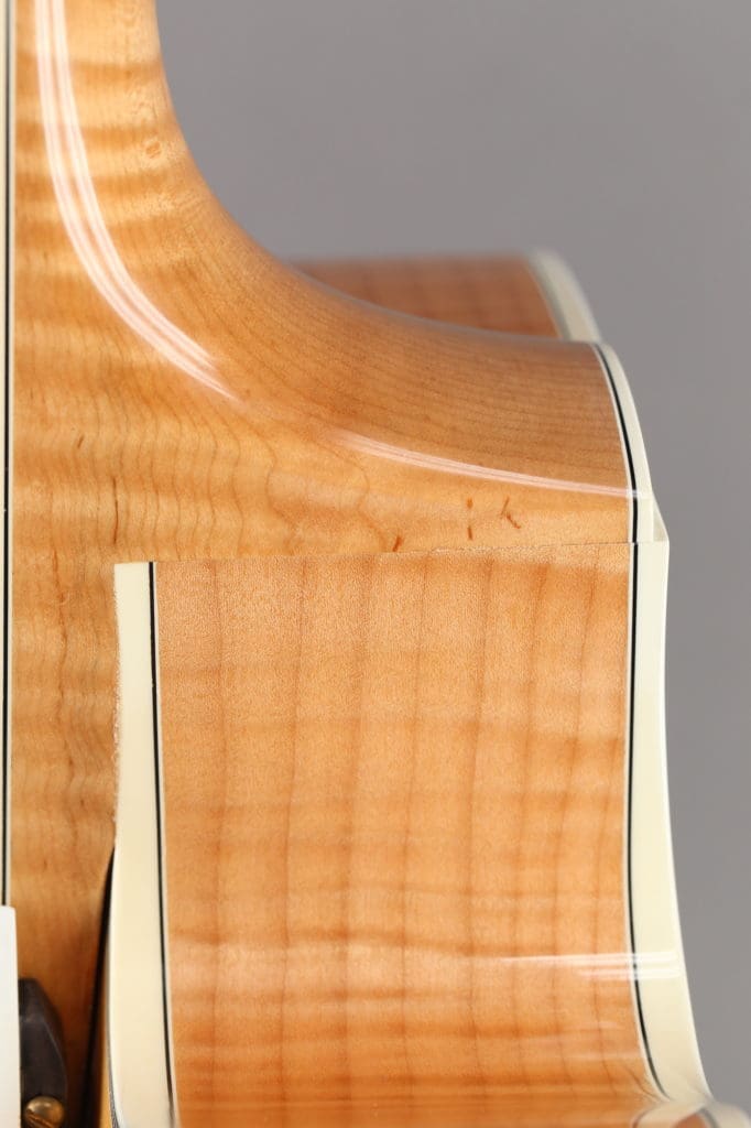 This is an excellent example of why we, and other Collings dealers, kept clamoring for AT-17 models, as it has everything you want in an acoustic archtop: clarity, balance, and if you need volume it’s there, almost without asking. There are a couple of light dings in the finish on the top, below the treble side of the bridge but above the tailpiece. The thin lacquer finish has settled nicely into the grain of both the spruce and the maple, giving it a lovely patina. Everything is original including the frets, which have only minor wear.