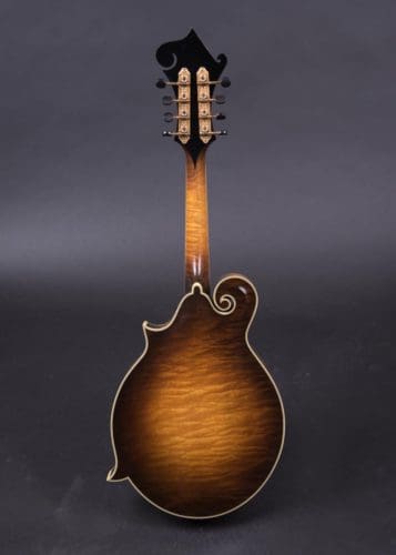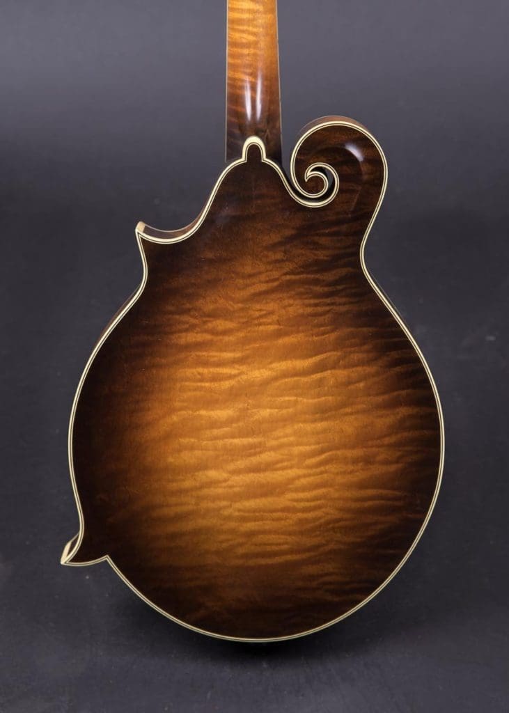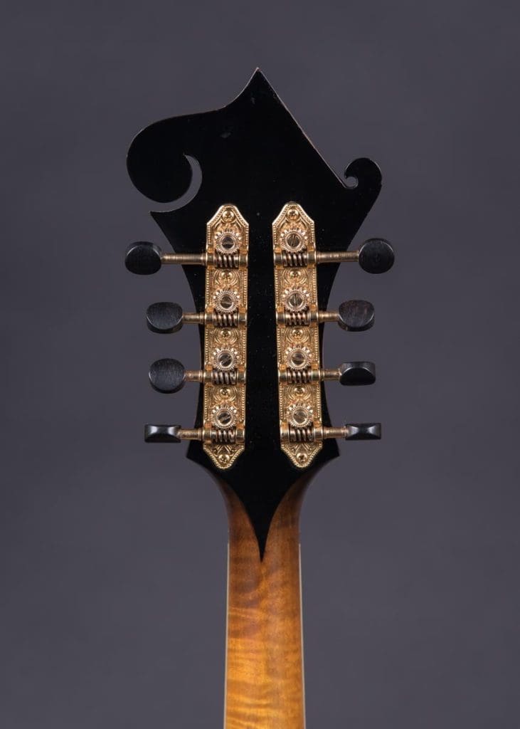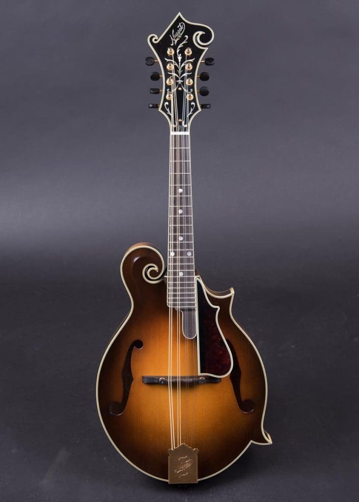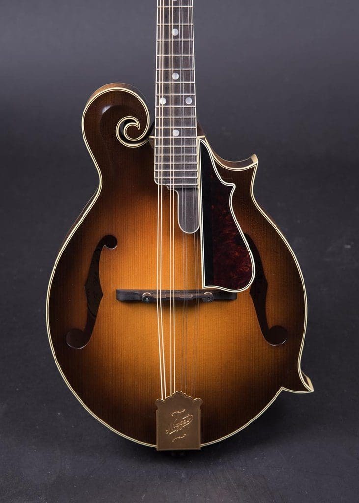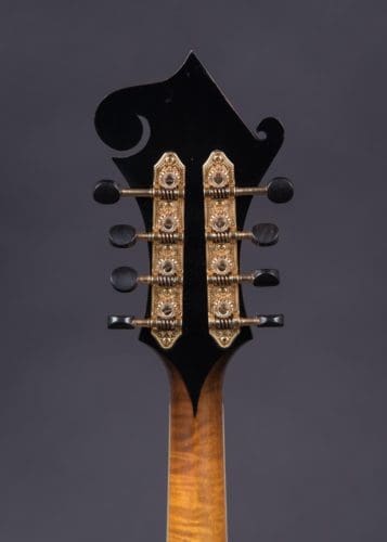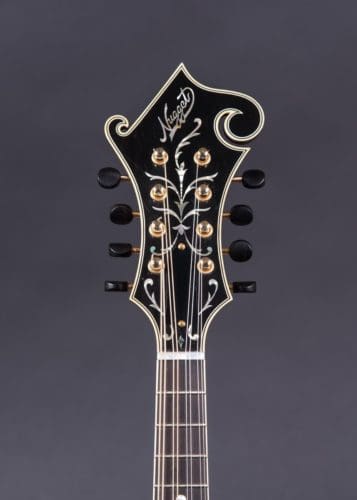 Regarding the instrument’s particulars, it sports a narrow-ish 1-1/16” nut, tonebar bracing and a radiused fingerboard (the older F-5’s fingerboard is flat). The appointments are typically “deluxe”: gold-plated hardware, fancier binding and Mike’s take on the classic Gibson “Fern” inlay on the headstock. Carter has kindly made two separate videos with the instrument, so you do get a chance to hear it, even if you cannot make the (highly recommended) trip to Nashville. We can also offer the opinion of Leftover Salmon’s Drew Emmitt, who favors his own Nugget F-5 Deluxe and told author Larry Howe in issue 38, “A lot of bluegrass cannons are loud, but most of them sacrifice tone for power. Nuggets have it all—power, clarity and warmth through the range of the instrument.”