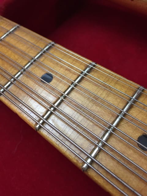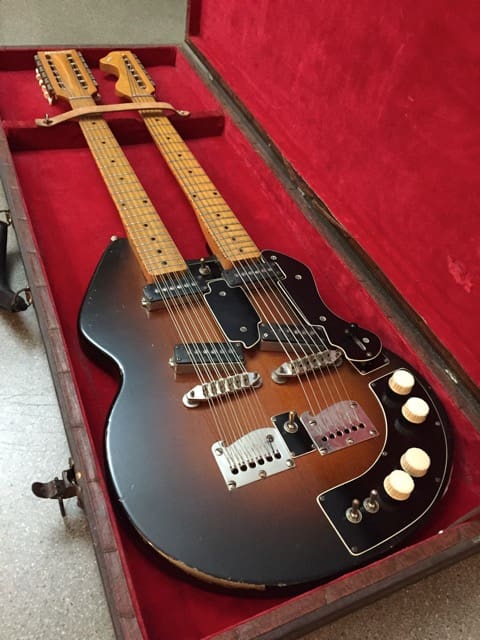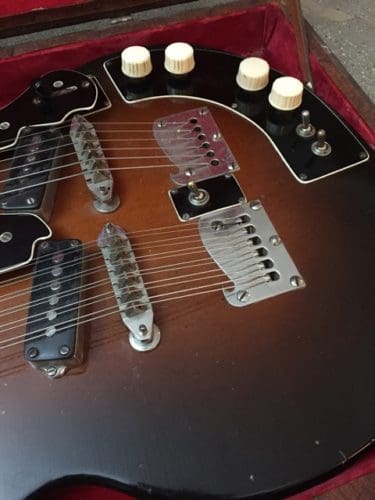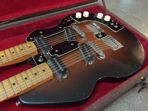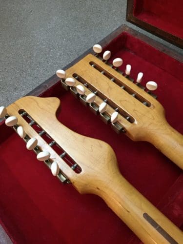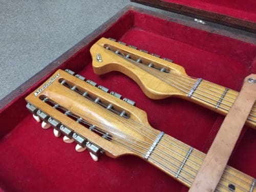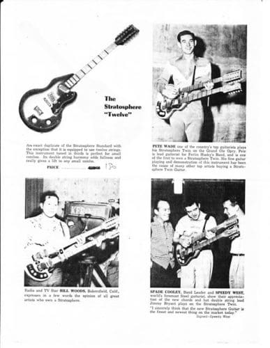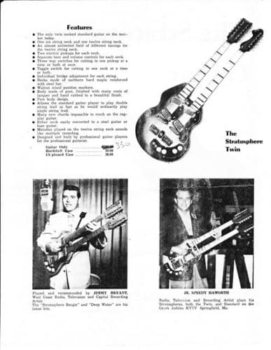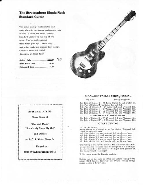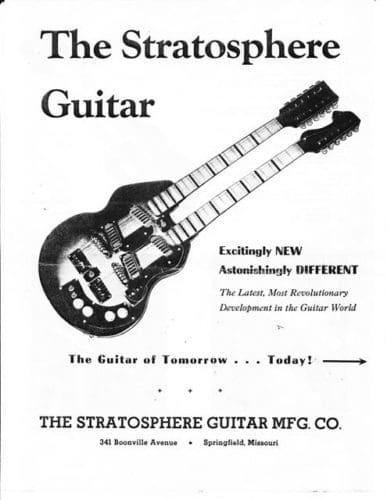 The Stratosphere guitars were made for a short period between 1954-1958 by two brothers, Russ and Claude Deaver in Springfield, MO. I’m not sure how many guitars the guys made. I’ve heard different numbers but I think fewer than 200. The twelve string neck is tuned in major and minor thirds, rather than octaves which requires basically re-learning the guitar. The idea was that one person could play twin guitar licks. Being a small business owner myself, and a guitar player, I’ve always had a soft spot for creative small business ventures.