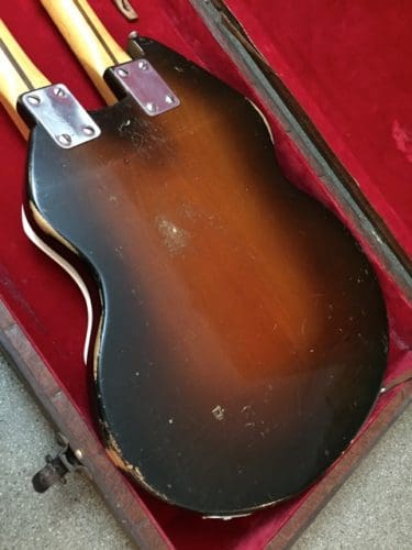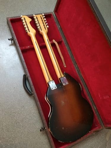 Here’s something unusual for your consideration: TK Smith’s Stratosphere Twin (circa 1956 or ’57), an eye-catching oddball of a double-neck guitar for those of you obsessed with the Boogie. This rare beast is, frankly, a little outside of our comfort zone, but, as far as the basics are concerned, we’ve got two steel-reinforced hard maple necks (one 6-string and one 12-string, tuned in minor and major thirds, rather than octaves/unisons) attached to a sunburst gum (yes, gum) wood body, two pickups with separate volume and tone controls and a 3-way toggle switch for each neck and a 3-way toggle to switch between the necks or use both (!) at the same time.