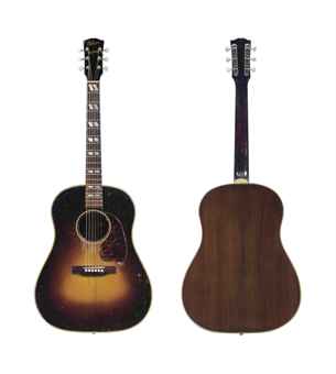 I ask about one other guitar. It’s a 1943 Gibson Southerner Jumbo, or SJ. One of the rosewood examples. I’m drawn to it because I’m a fan of wartime Gibsons in general and of the SJ in particular. Plus, the catalog page quotes my not-quite-finished book on these “Banner” Gibsons that bear a silkscreened banner bearing the mantra, “Only a Gibson is Good Enough.” “That guitar,” answers Gere, “is amazing. That’s the guitar that I kept next to my desk so that I could pick it up whenever I wanted to.”