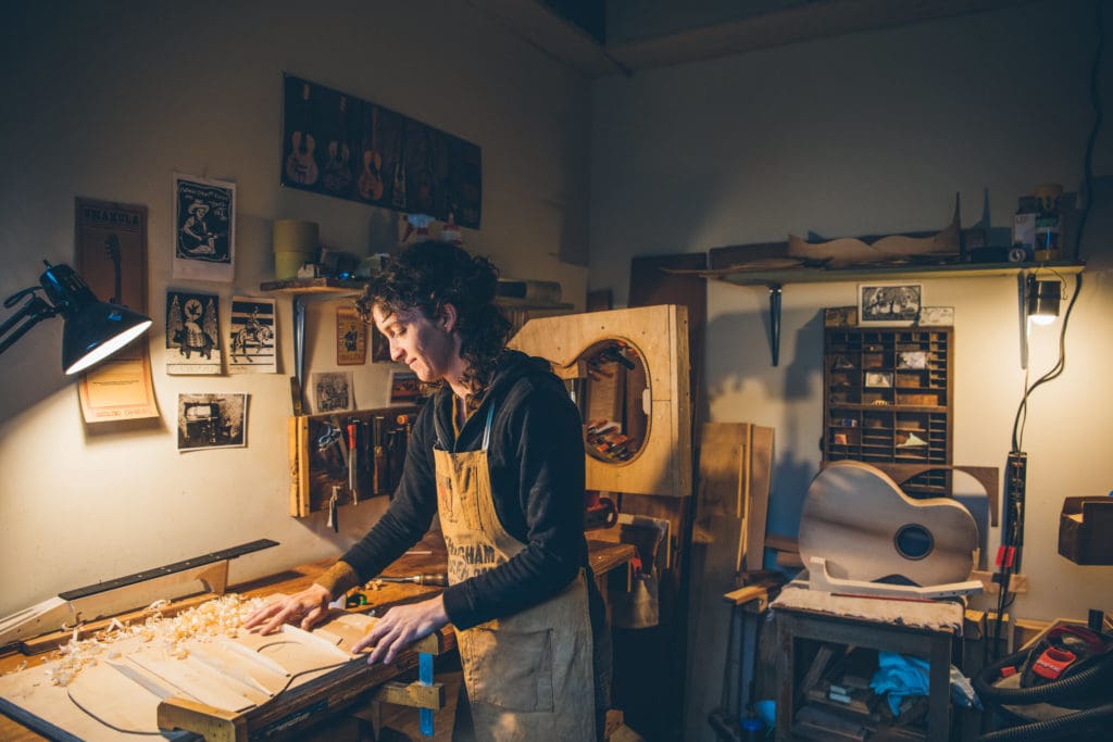Here’s one for #FJFest’s virtual guitar show — Aviva Steigmeyer of the Preservation Guitar Company shared some photos of her shop and a few gorgeous finished guitars. Aviva apprenticed with Todd Cambio of Fraulini Guitars and it’s easy to see their shared appreciation of the guitars from American lutherie’s nascence in the early 20th century. As she told us in her bio, since 2013 she has been building her own instruments in “a small, one-woman shop located in Fayetteville, Arkansas. Her focus is on small-bodied guitars built with American hardwoods using hot hide glue, mostly hand-tools, and a hand-rubbed French polish finish.”
