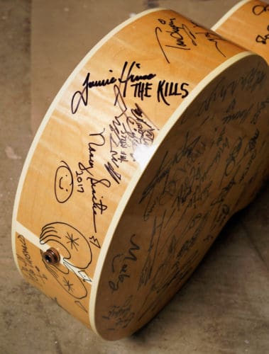 RC: The shop originally acquired the guitar in a trade. Mike Viola traded it for an electric guitar that I had built. This was almost seven years ago. The guitar was signed by Tom Petty and Viola won it in a charity auction for Hurricane Katrina relief. The guitar hung in the shop for years – I’m not the best at peddling rock memorabilia. It seemed a natural choice for the effort as the guitar already had one signature on it. I was on my way! And yes, the guitar sounds great. The type of guitars that get signed by celebs are usually a bummer. This one is nice.