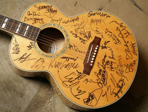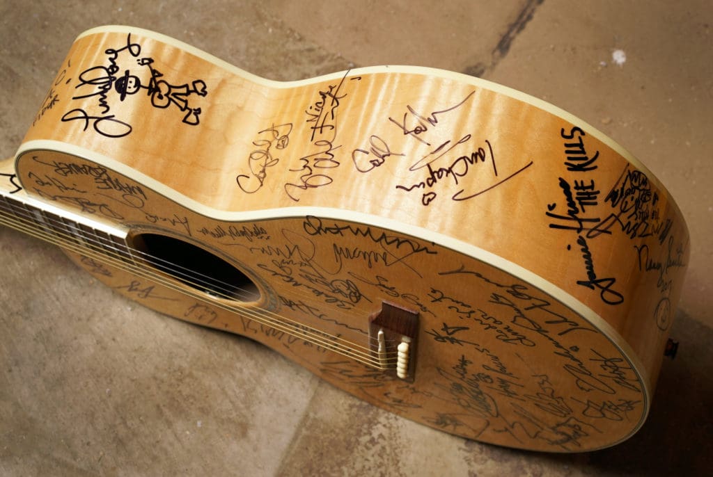 I’ll go right out and say it: I usually hate autographed guitars. Yes, I know there are great examples of servicemen carving their names into WWII-era ukuleles and fans chasing down their lifelong blues heroes to get a signature on a pickguard… those I get. They tell a story. But I never understood the appeal of a Korean-made mass market guitar that happened to be signed by an artist, who probably never even bothered to strum it once, going to auction.