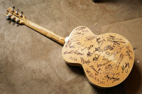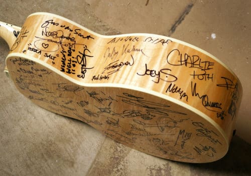 RC: My original ambitions were modest. Ten or fifteen and then eBay the guitar. When Jackson Browne signed the guitar, he said, “You should just jam the thing with signatures.” The guitar has light-colored maple back and sides. It wants to signed everywhere! I had no idea where things would lead but happily the guitar ended up with over one hundred signatures.