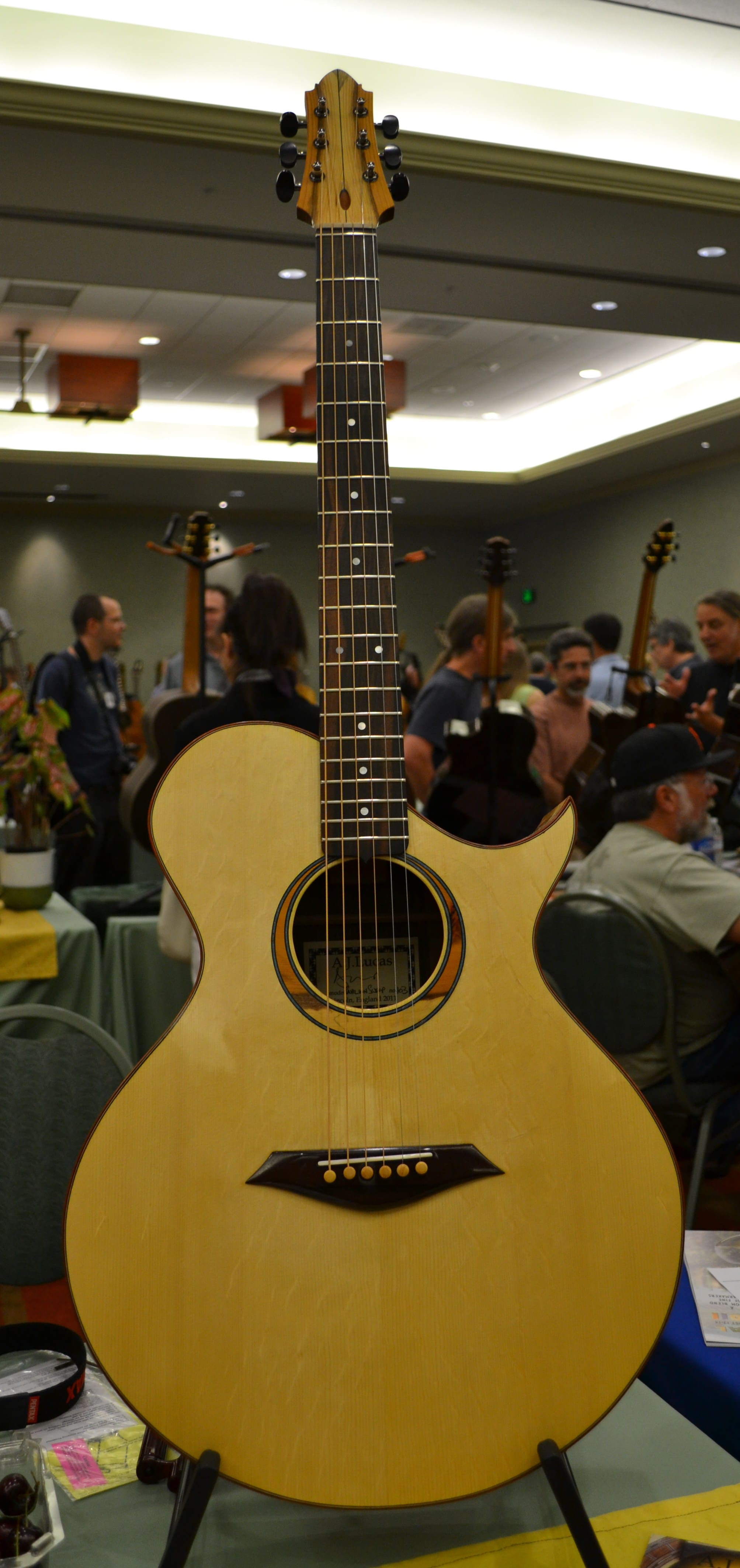 AJ Lucas fingerstyle guitar. Every detail of this guitar is, to my eyes, gorgeous. A lovely cutaway that produces an 18th fret neck/body join and subtle and sophisticated visual details throughout. The yew sides, yew back with wenge centerpiece, and European spruce top produce the most visually stunning guitar in the show. A big and warm yet clear sounding guitar that balances perfectly in the lap.