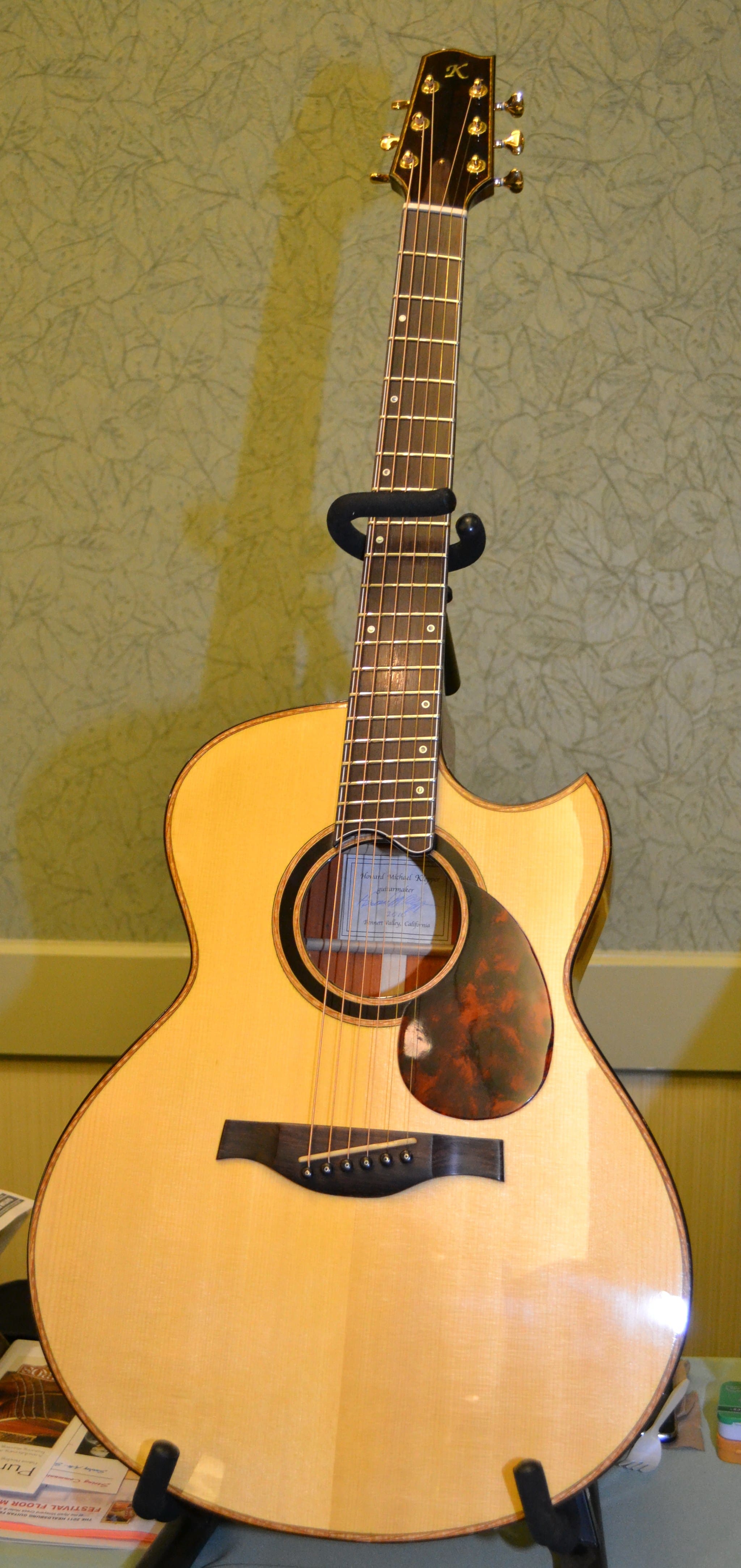 Kostal OM. A friend snagged this guitar before it got to Healdsburg. Lucky guy! Gorgeous, aesthetically adventuresome, and great sounding. It sports the finest set of koa for its back and sides that I’ve seen in years and a lovely European spruce top. Michael Watts of The North American Guitar put this guitar through its paces while doing a demo concert for Jason Kostal. As Michael later put it to me after the demo, this beauty “is truly spectacular.”