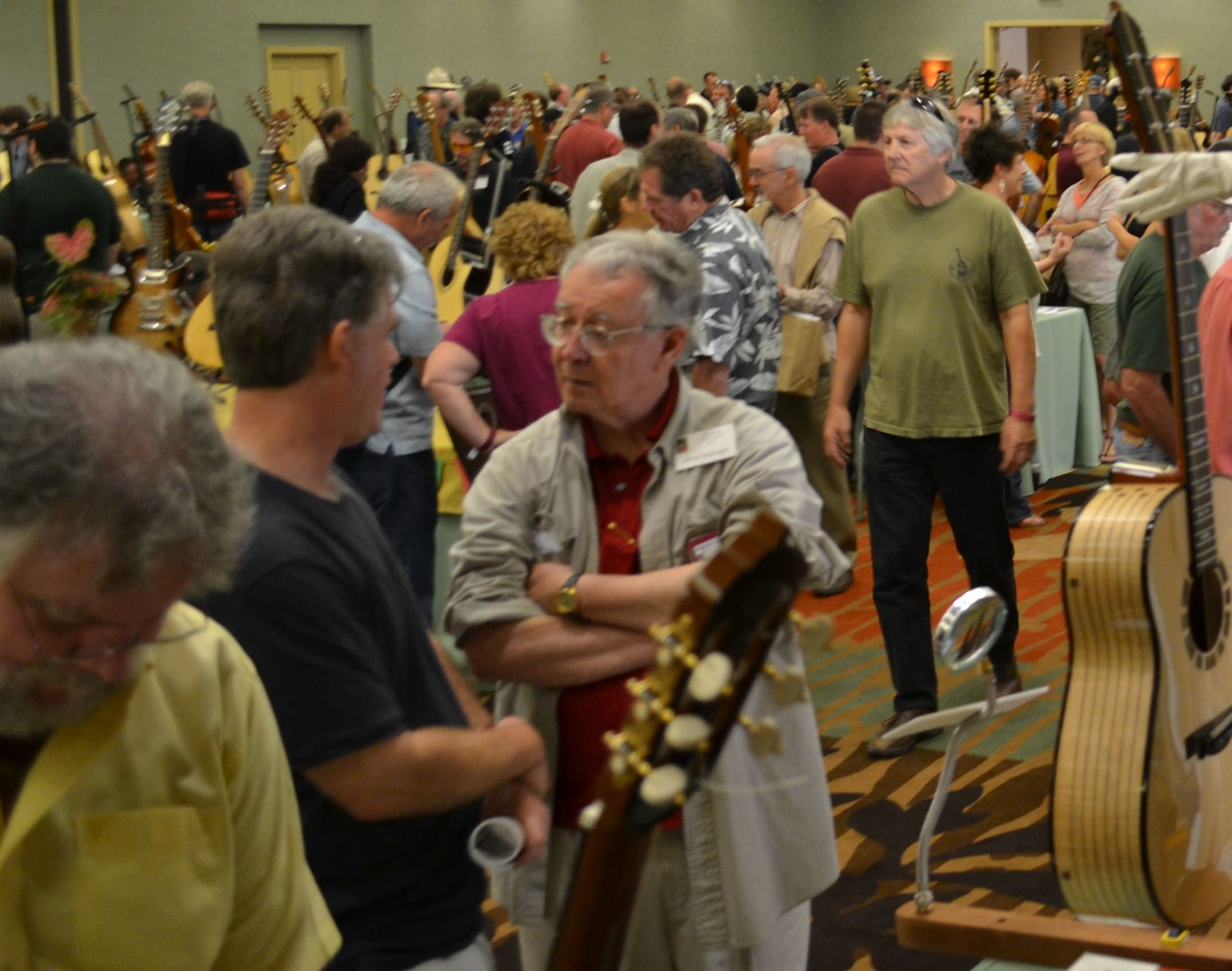 OK, I admit that I’m a curmudgeon. I walked into the Healdsburg Guitar Festival, now held in beautiful Santa Rosa, California, saw all of those gorgeous guitars with wide, spalted rosettes, bevels, side ports, and wood bindings, and immediately resolved to wander the room to play every guitar sporting a sunburst finish and/or ivoroid binding. Really. But, then, juvenile point (not) made, I went back through the work of the 120 plus exhibitors and played every guitar that I could get my hands on. Again, really. It took me the better part of two and a half days and I can honestly say that I didn’t meet a guitar I didn’t like. The standard of craft is astonishing. Row after row of perfectly built, beautifully decorated, and wonderfully playable guitars. Fingerstyle flattops ruled the roost, but there were a few dreadnoughts and classicals, more than a score of archtops, an impressive number of ukuleles, a couple of harp guitars, and some solid body electrics. In short, just about anything a guitar player’s heart might desire.