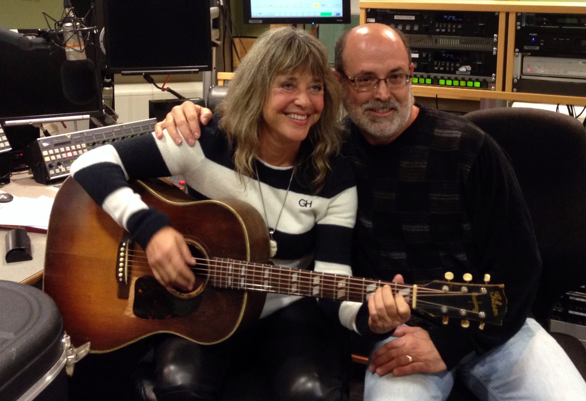 Quatro proved engaging and articulate. She’d read the book and came armed with notes. What really caught her attention, though, was the 1943 Gibson I brought to the session. The instrument’s first owner was a soldier. He bought it new and took it to the war, dragging it from foxhole to foxhole. A “Southerner Jumbo” model, it’s not a collectible guitar in the customary sense of the word. The instrument’s finish has worn off, with the top having been adorned with some sort of brown stain that resembles shoe polish, the sides are au natural, and the back sports what might best be described as a mop ‘n glow over smear. A number of holes in the top bear testimony to pickups and pickguards past. But, what a pedigree! It’s the only Wartime, Gal-made Gibson that I’ve been able to document went “over there.” What a sound, too. I’ve yet to witness an experienced player who has not pronounced it one of the best sounding guitars on the planet. It also sounds a bit different than most WWII Gibson flattops. “Smoother,” “warmer,” “subtler,” “prettier” are the words players have uttered. Quatro played a few bass riffs on it and asked me to play a number of styles of music on it. “Sweet!” she proclaimed.