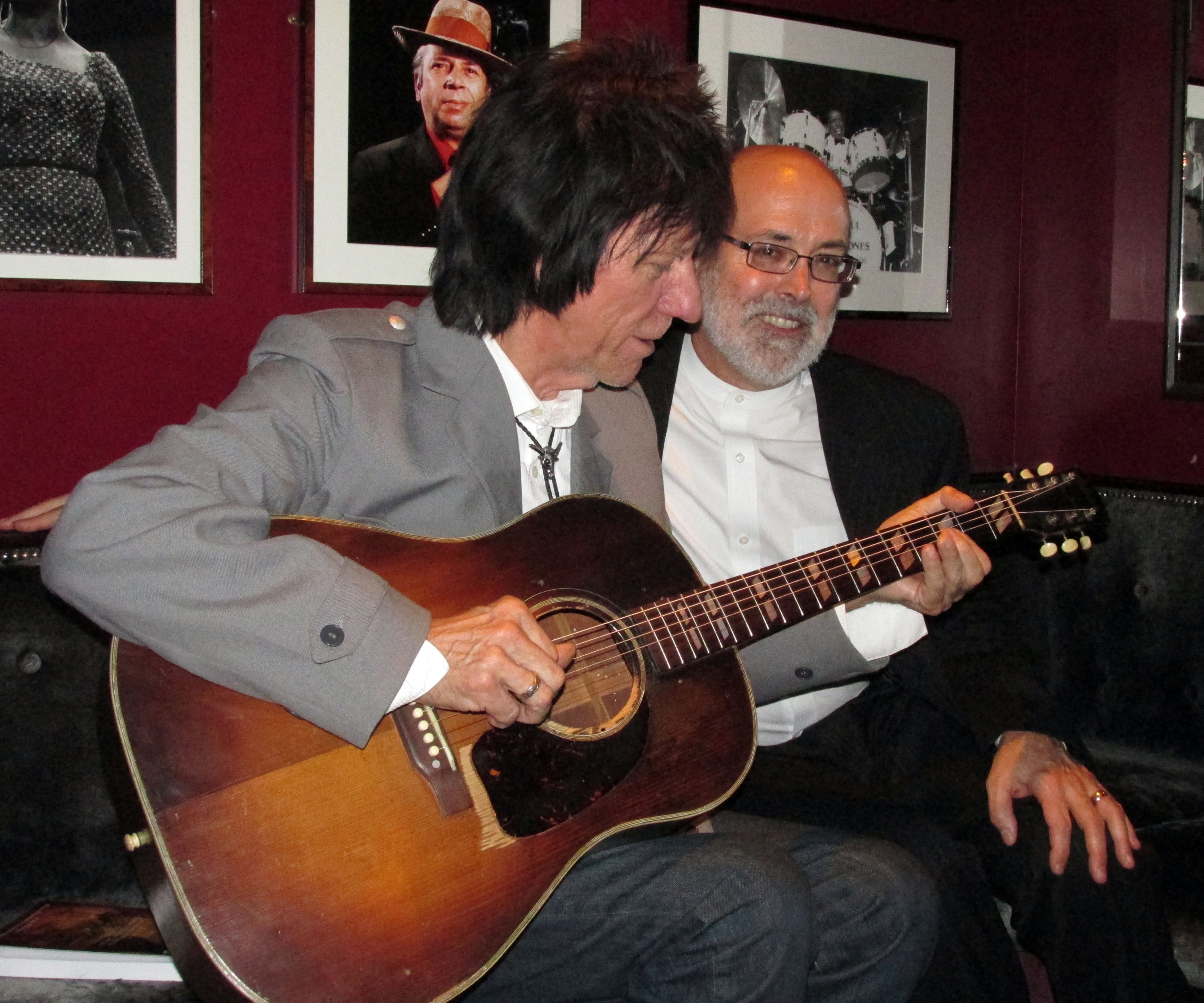 Following another series of blistering performances, the evening ends with hugs and good cheer all around. Beck comes over and compliments me. “Would you like to play my guitar?” I ask. “Please,” he replies. So, I hand Beck the guitar and he plays speed-of-light rockabilly licks on it.