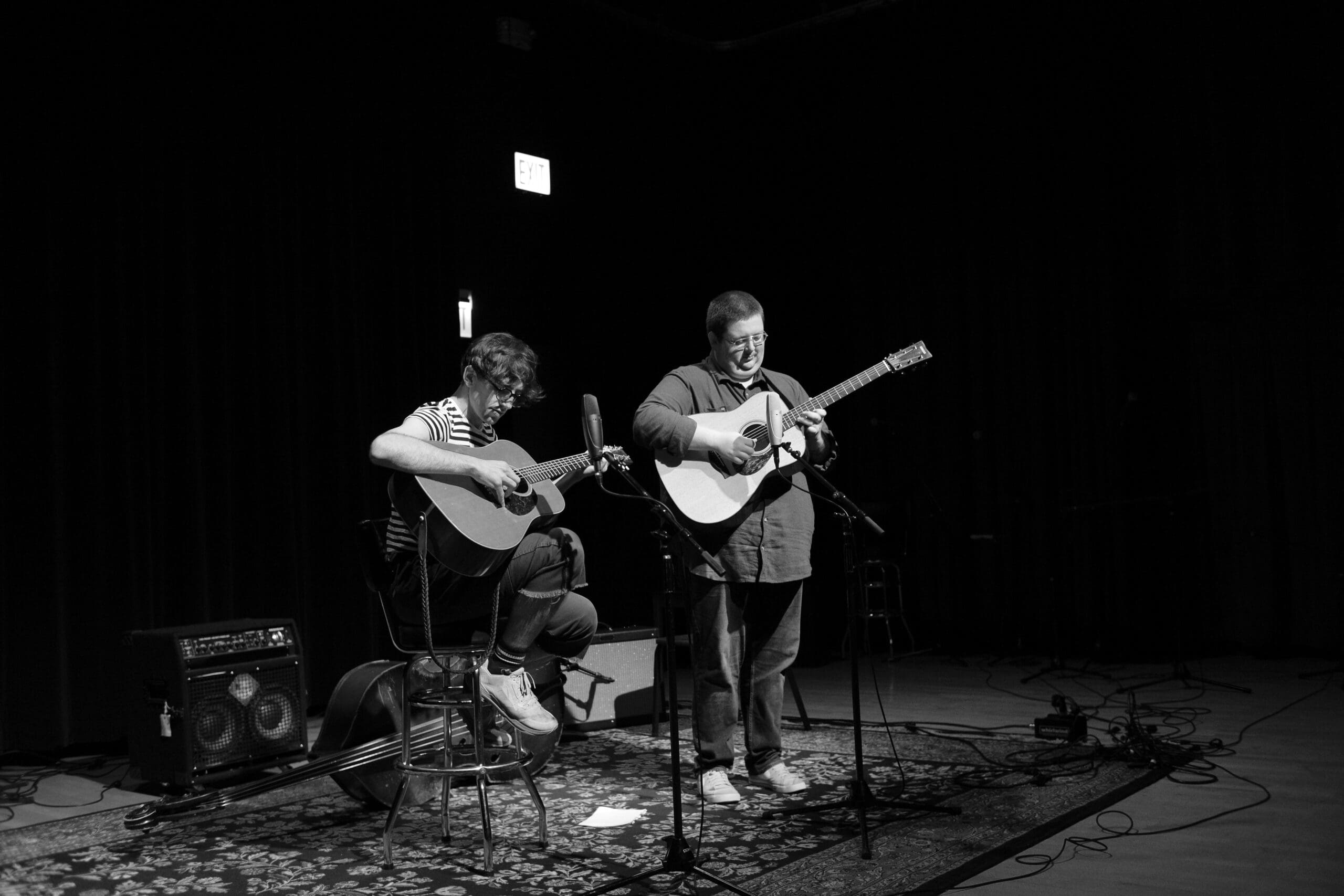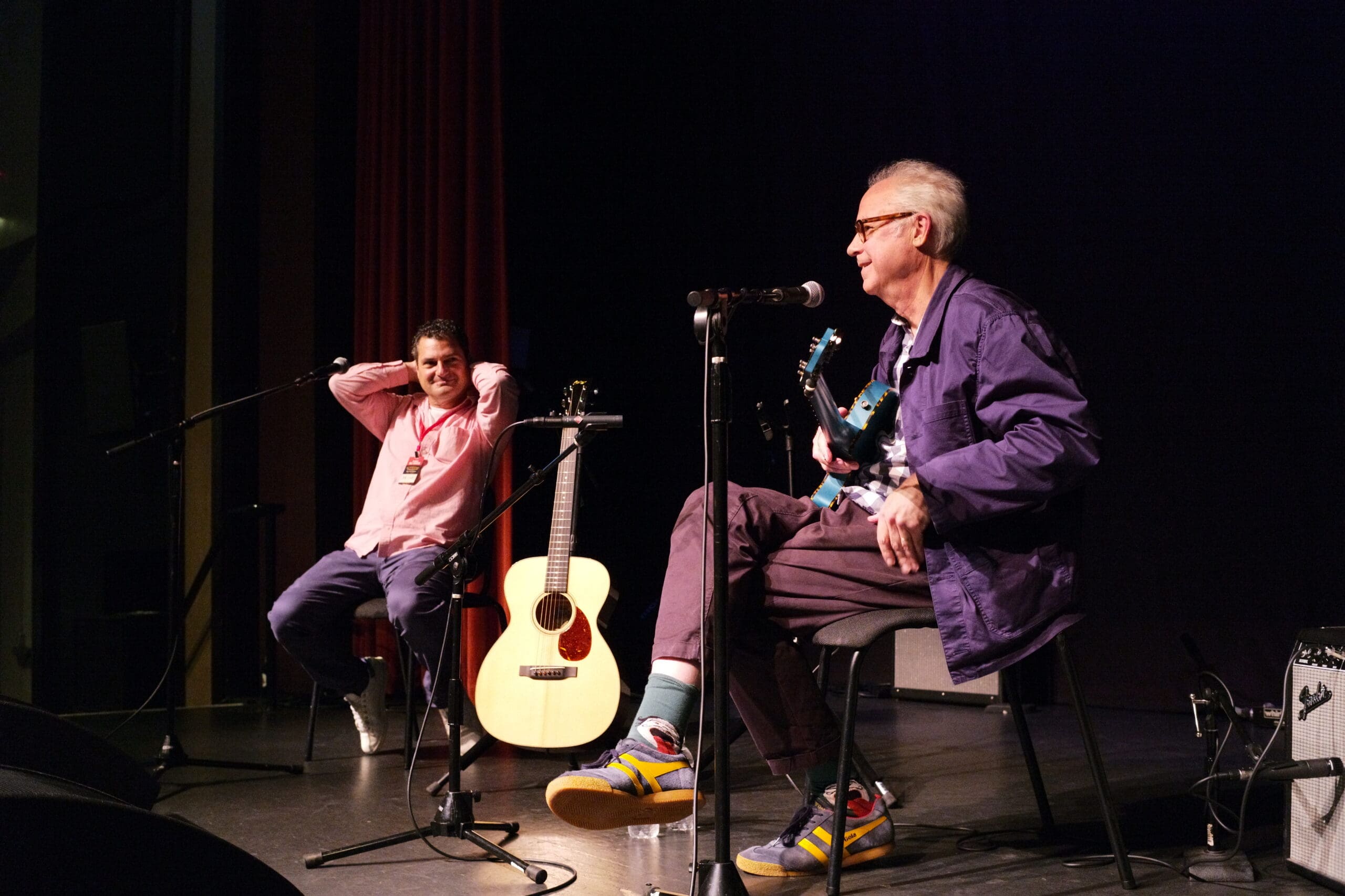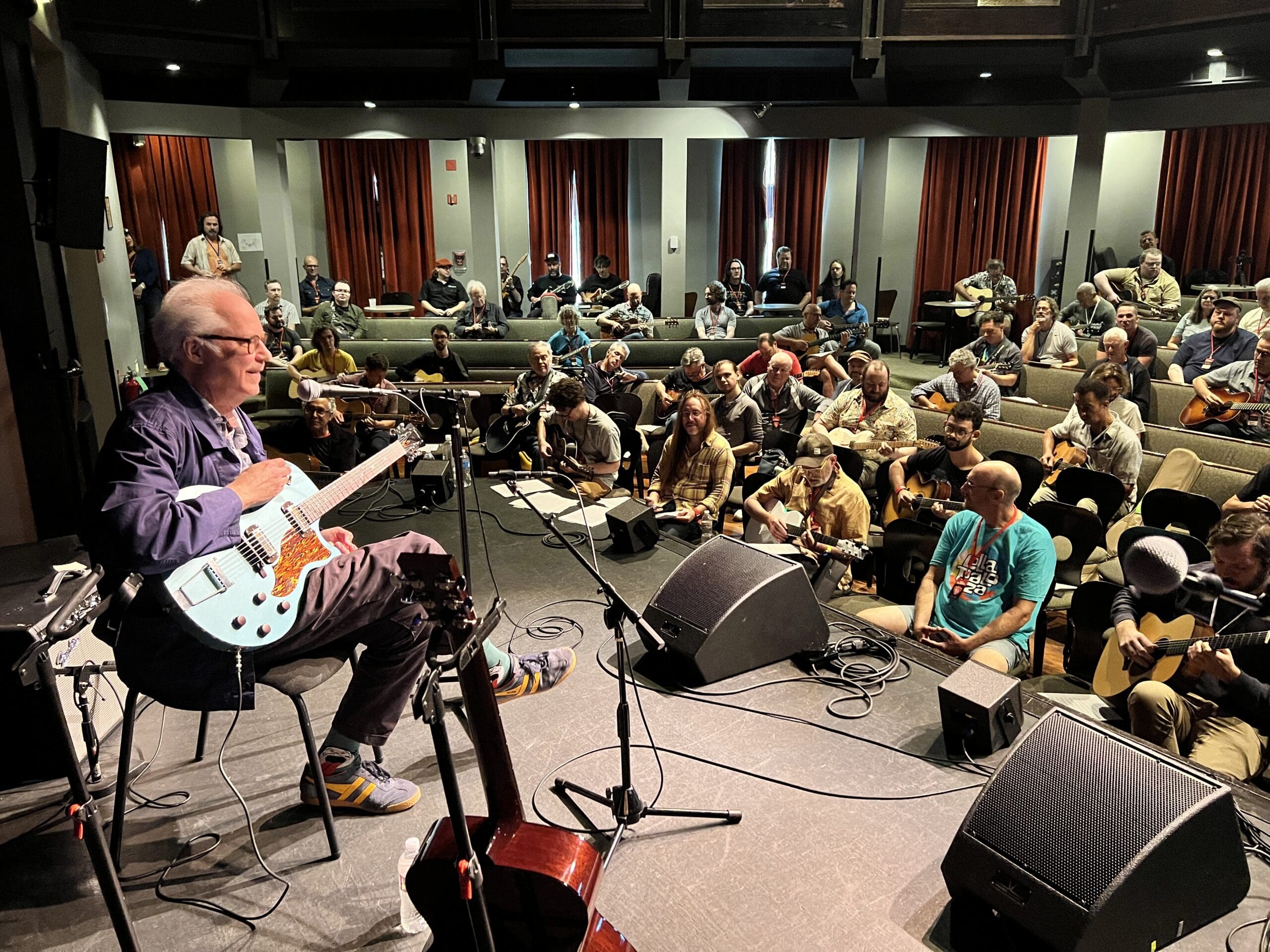 FJ publisher interviews Bill Frisell. We had nearly 60 guitarists playing alongside Bill on his “Poem for Eva.” Photo: Isaac Jang
