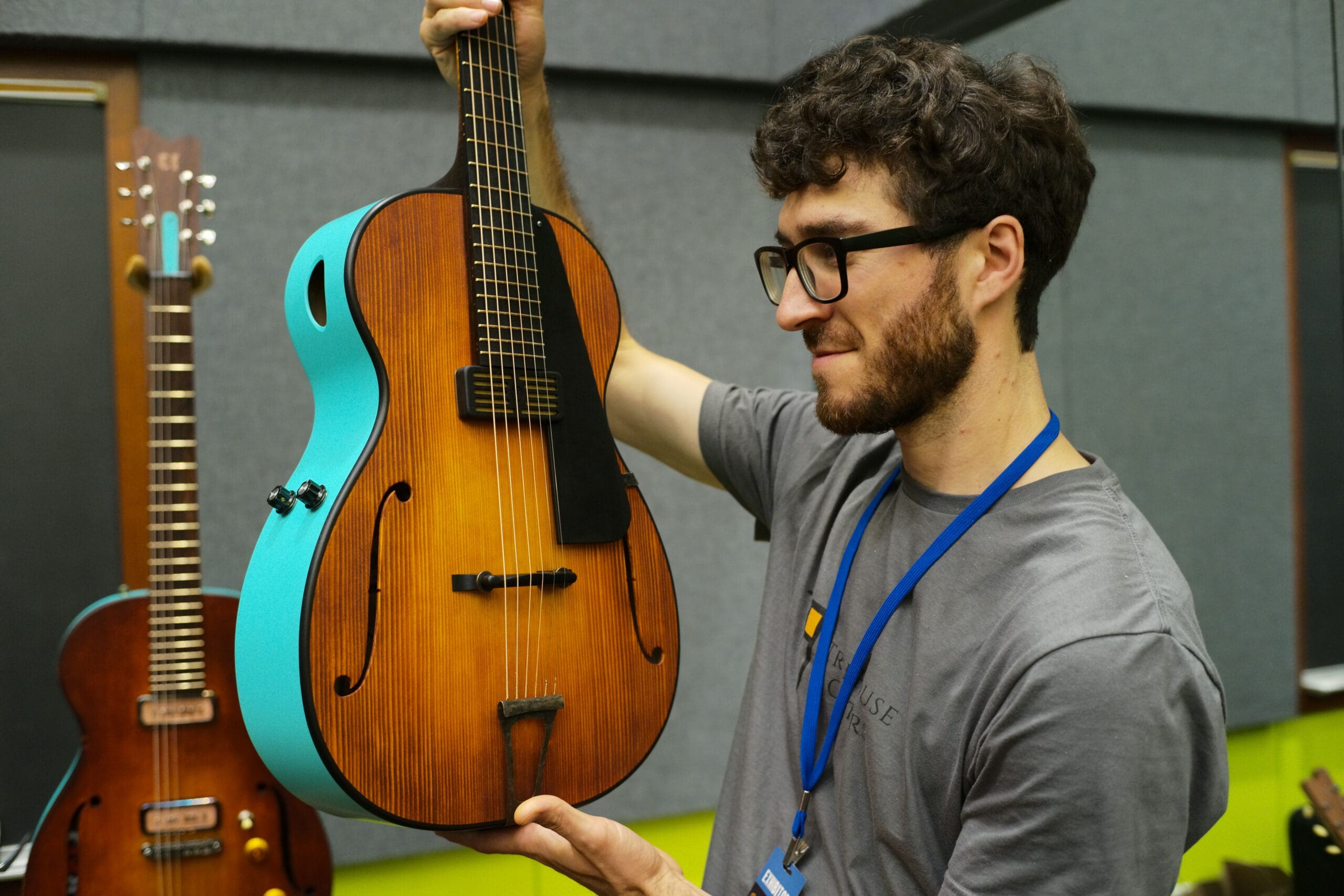 Zach from Treehouse Guitars with one of his more colorful creations. Photo: Isaac Jang