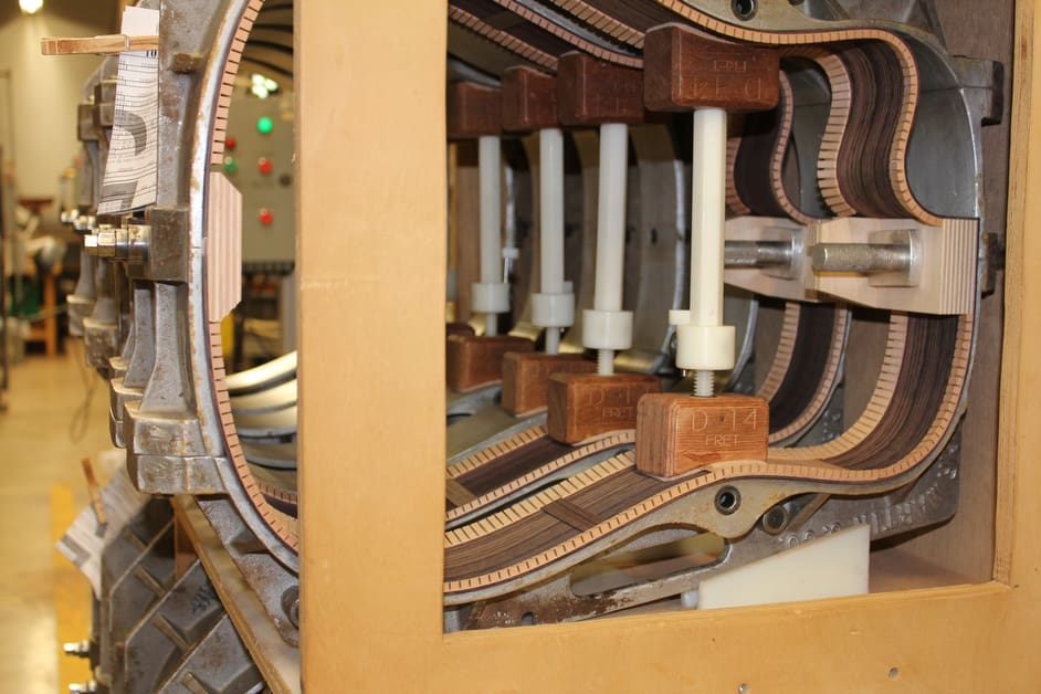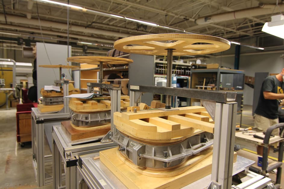 The guitar body is starting to take shape when it reaches this press. The back and sides have been glued to the top and back.